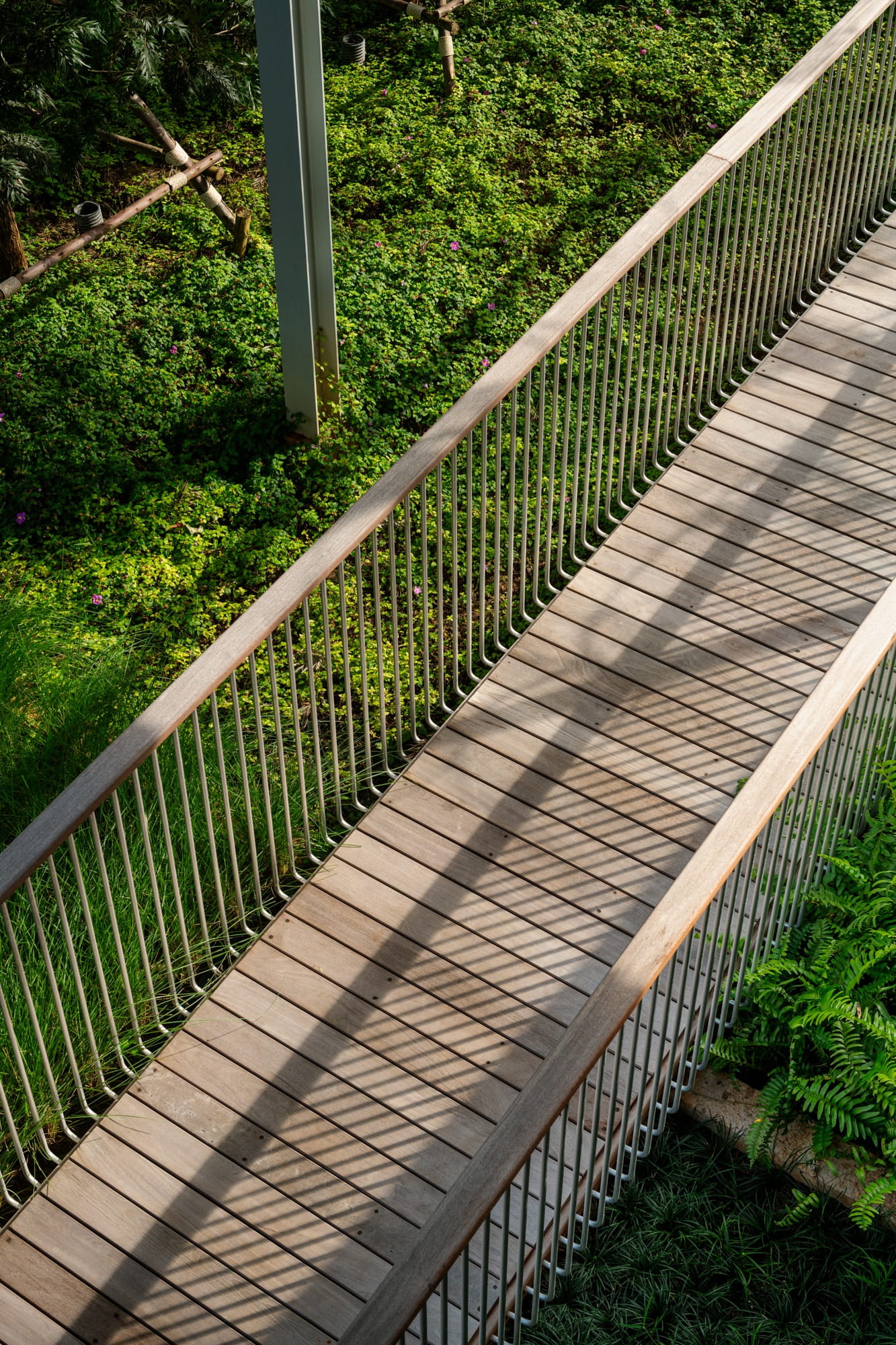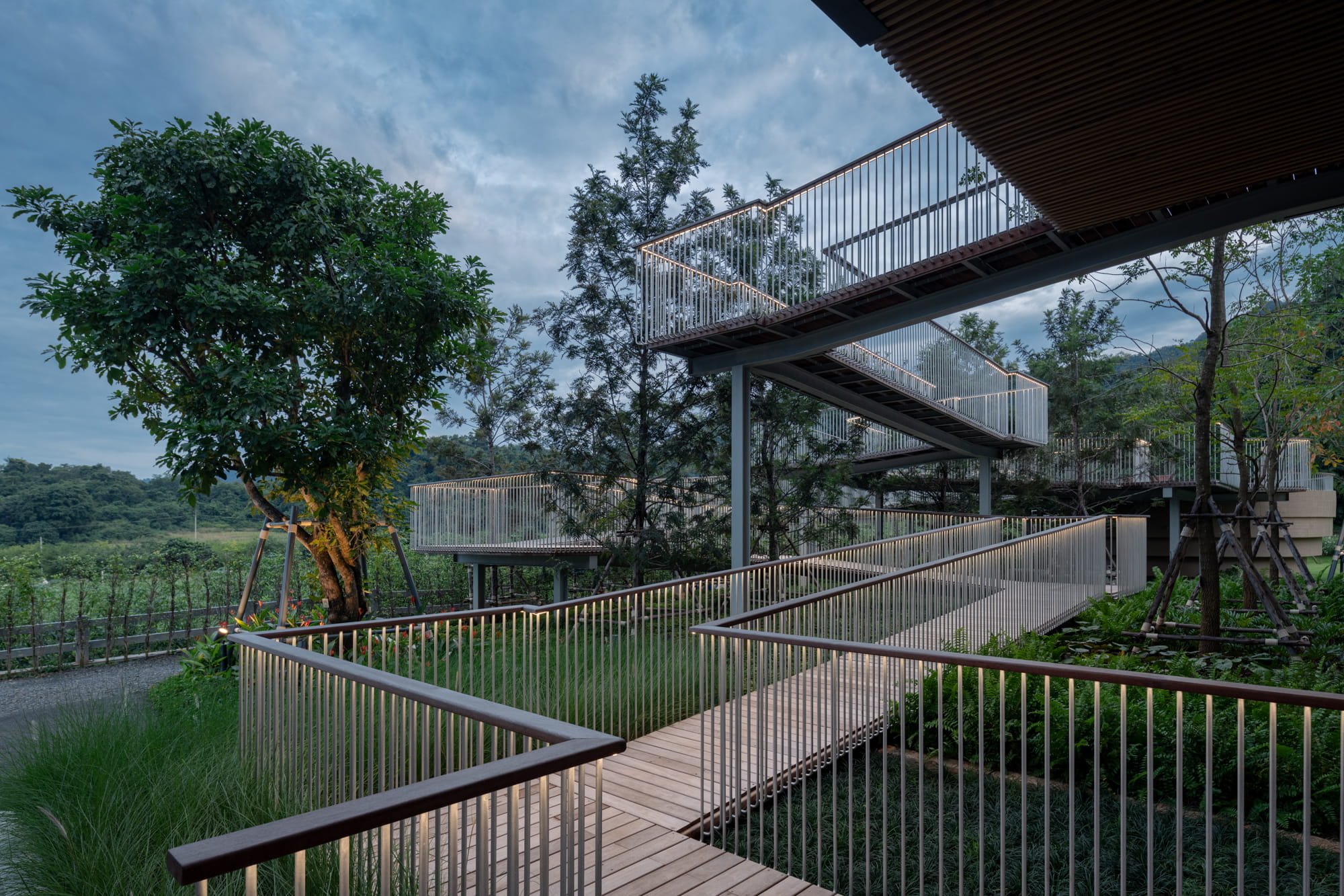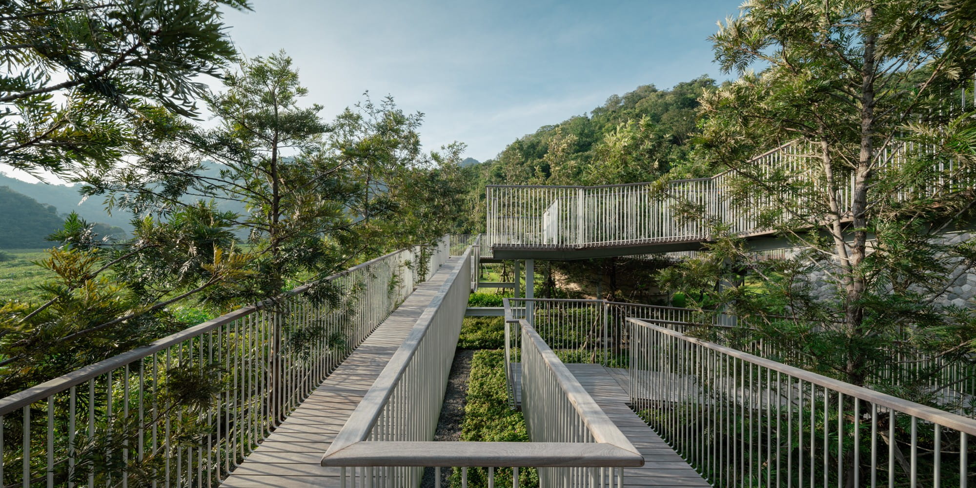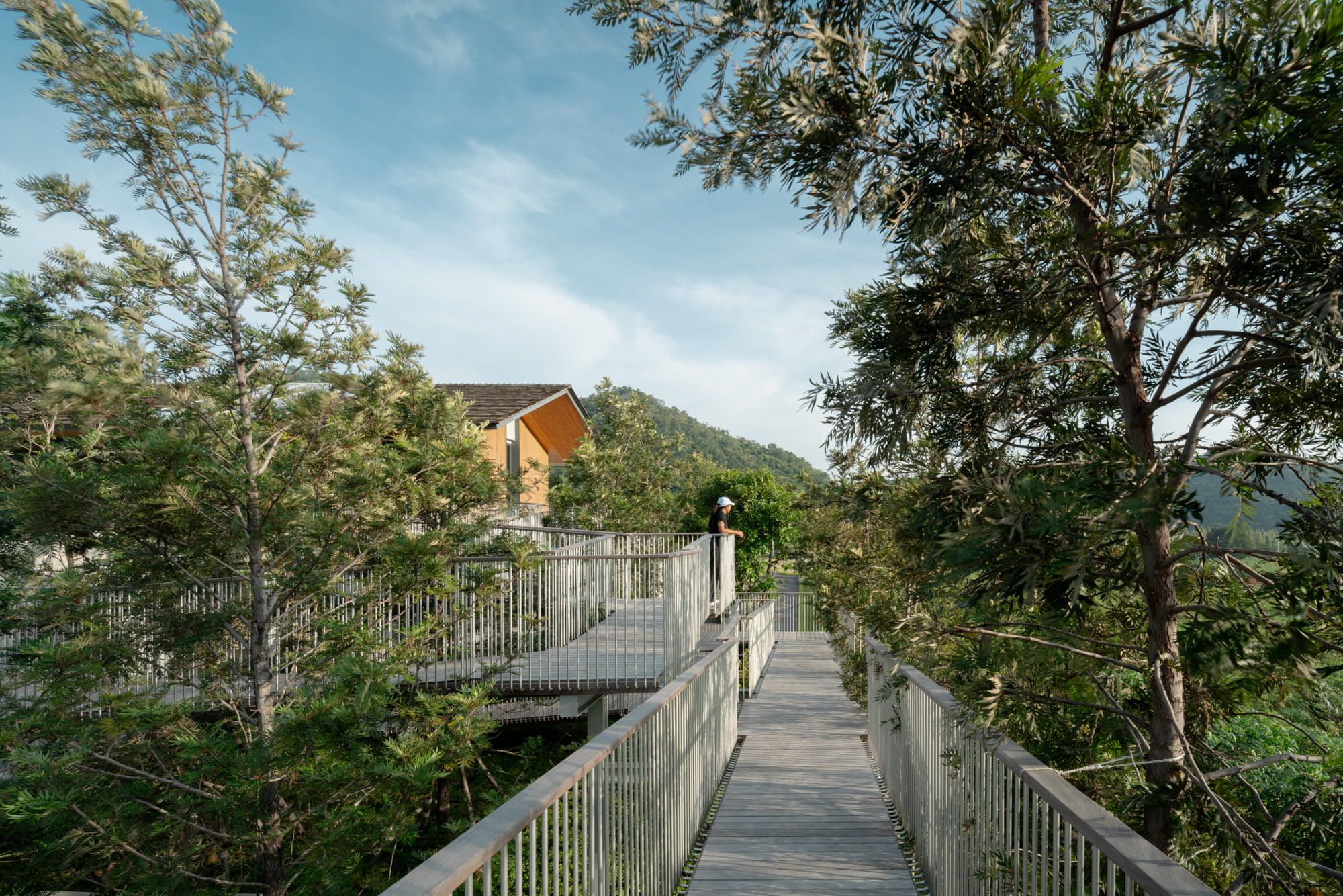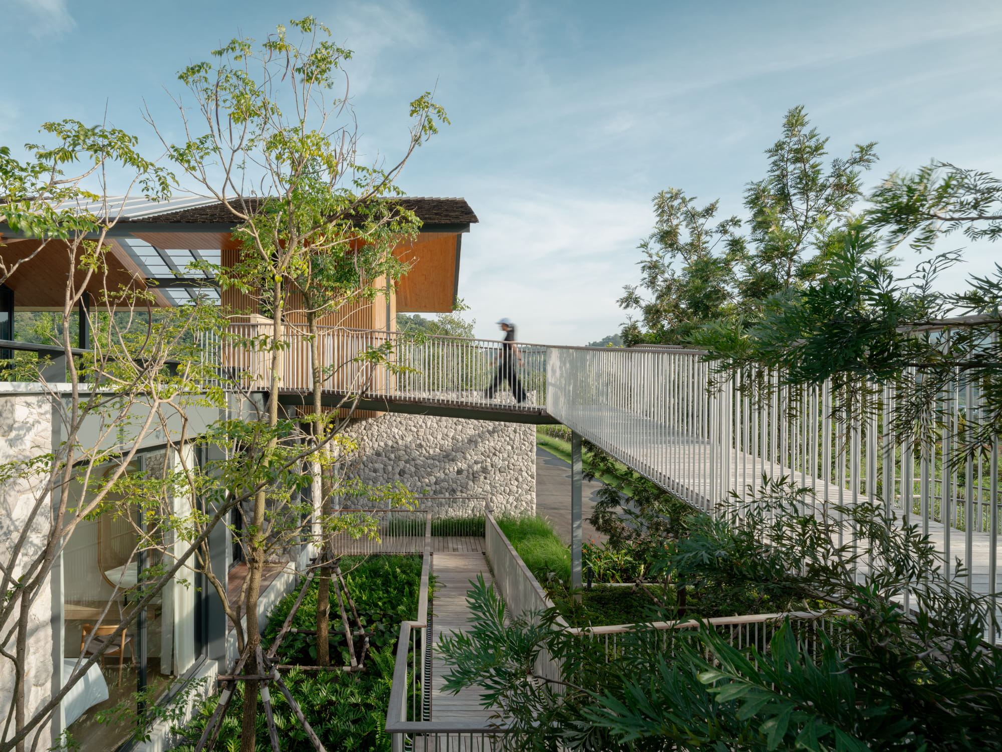 This elevated walkway serves not only as a path in transition between indoor and outdoor spaces but also as a place encouraging the interaction between human and nature with captivating scene of mountain and forest in the pristine nature of Khaoyai.