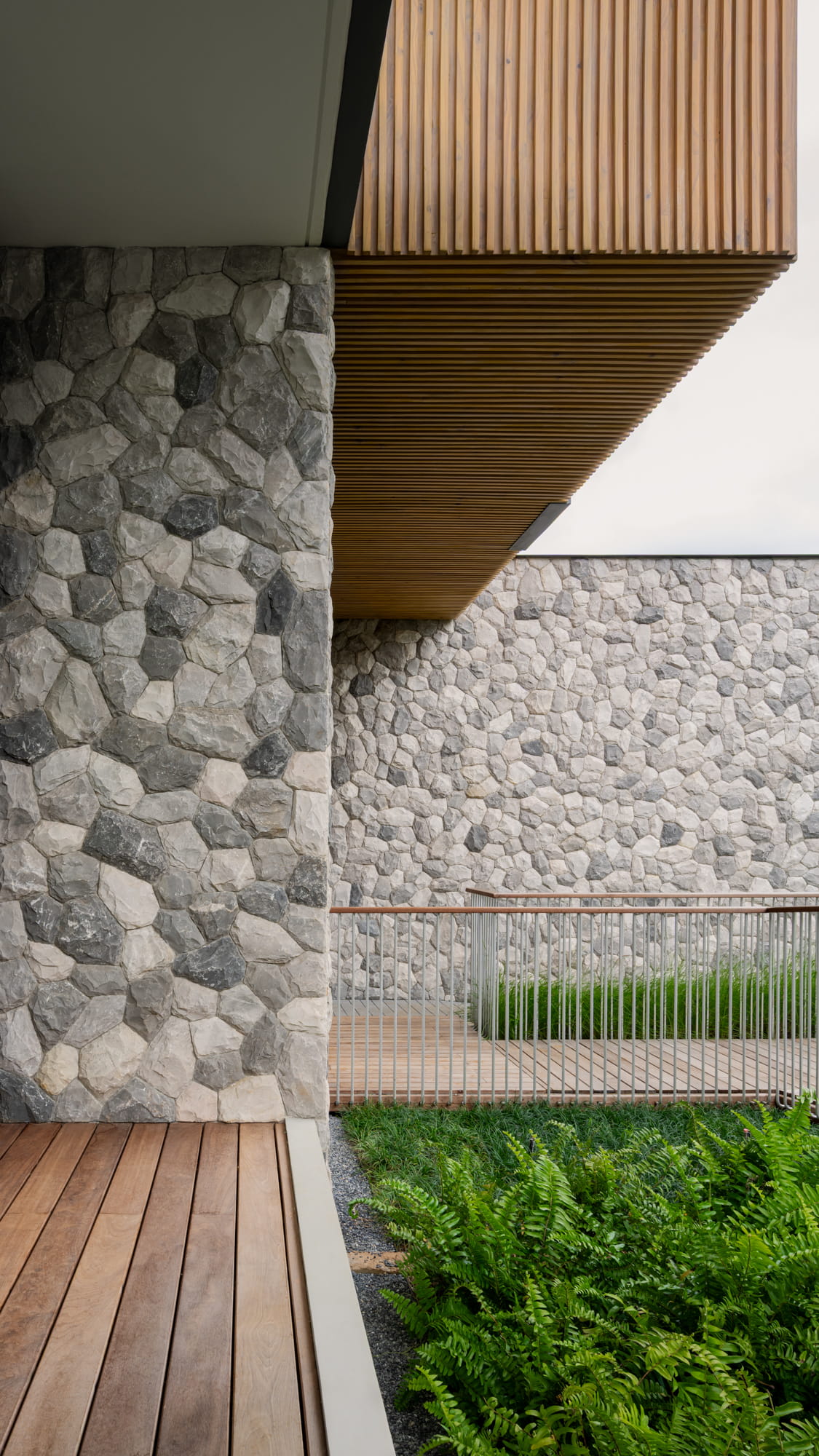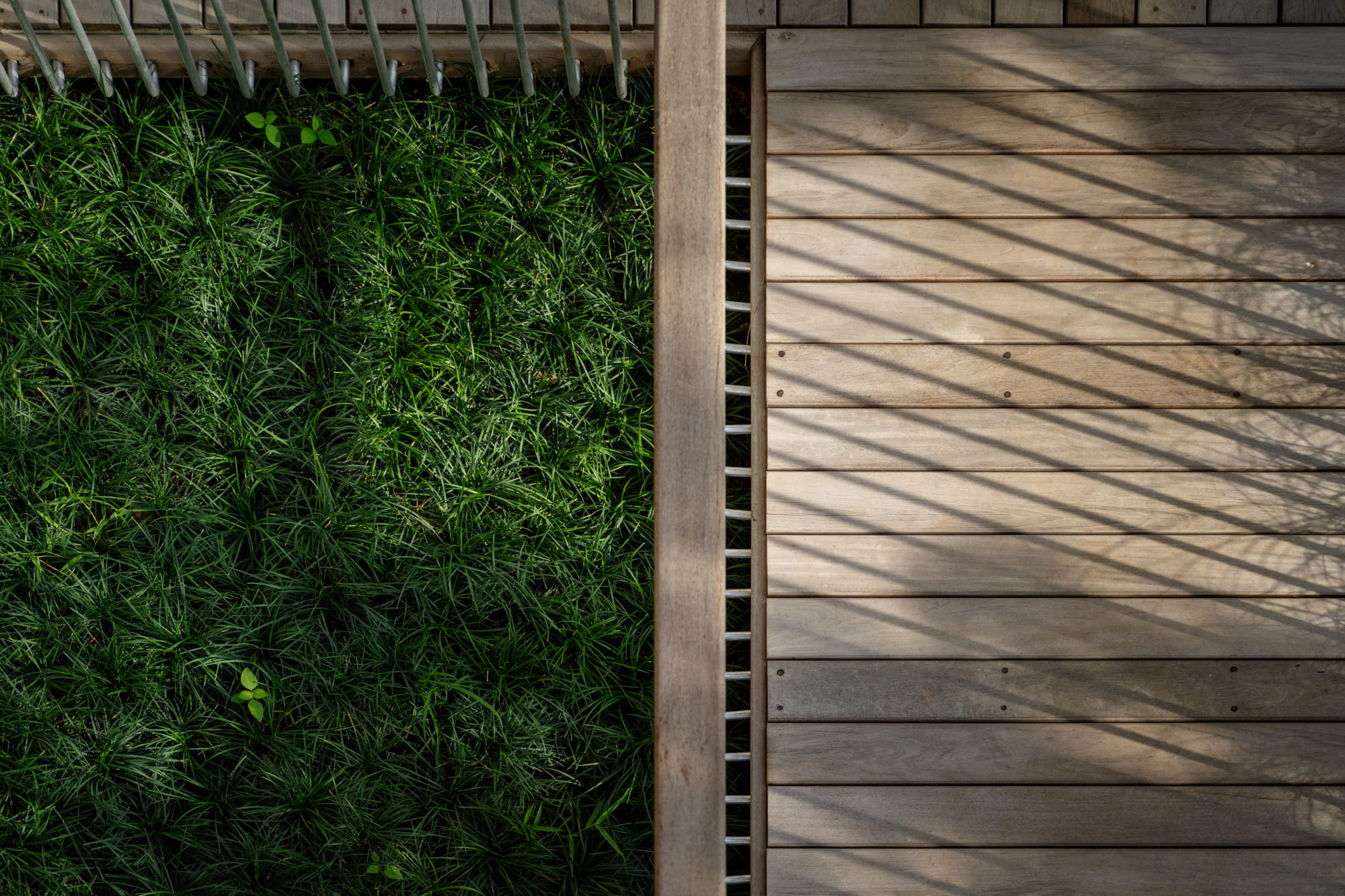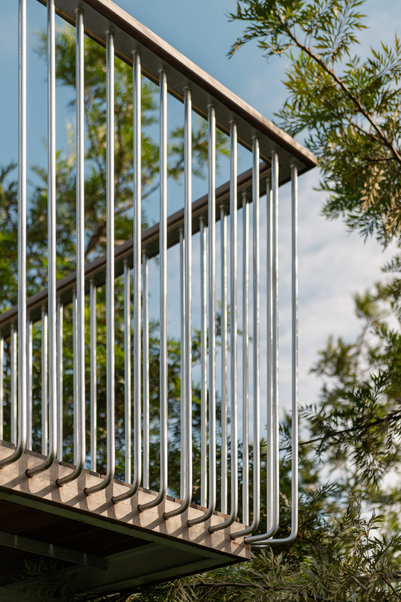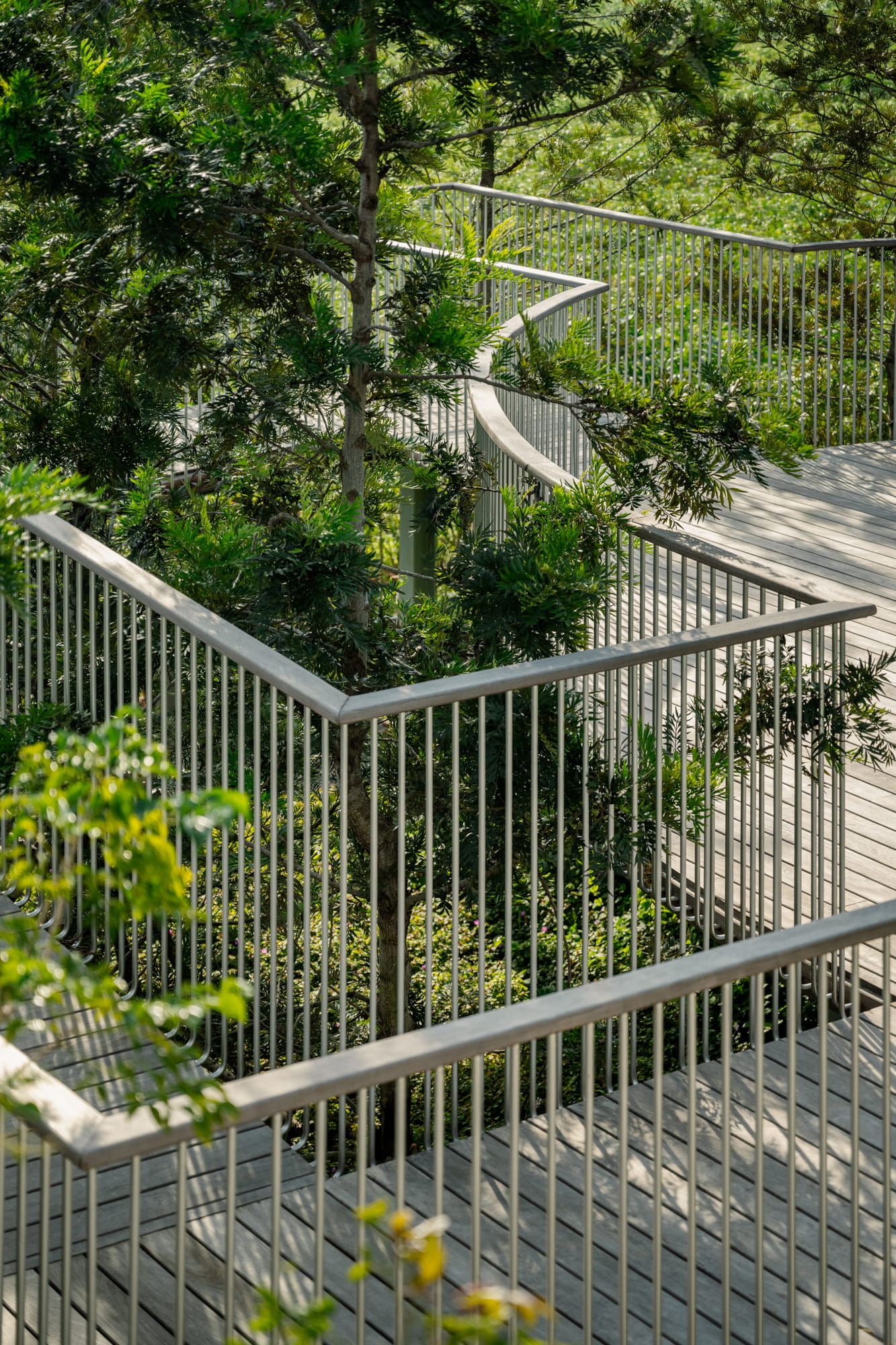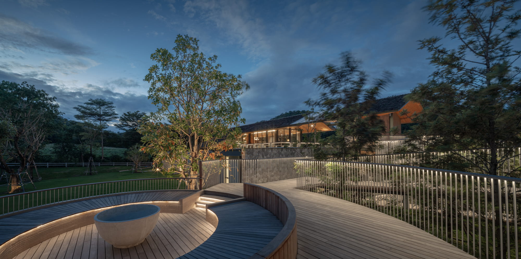 This elevated walkway serves not only as a path in transition between indoor and outdoor spaces but also as a place encouraging the interaction between human and nature with captivating scene of mountain and forest in the pristine nature of Khaoyai.