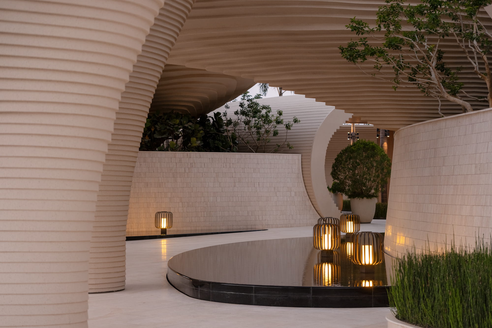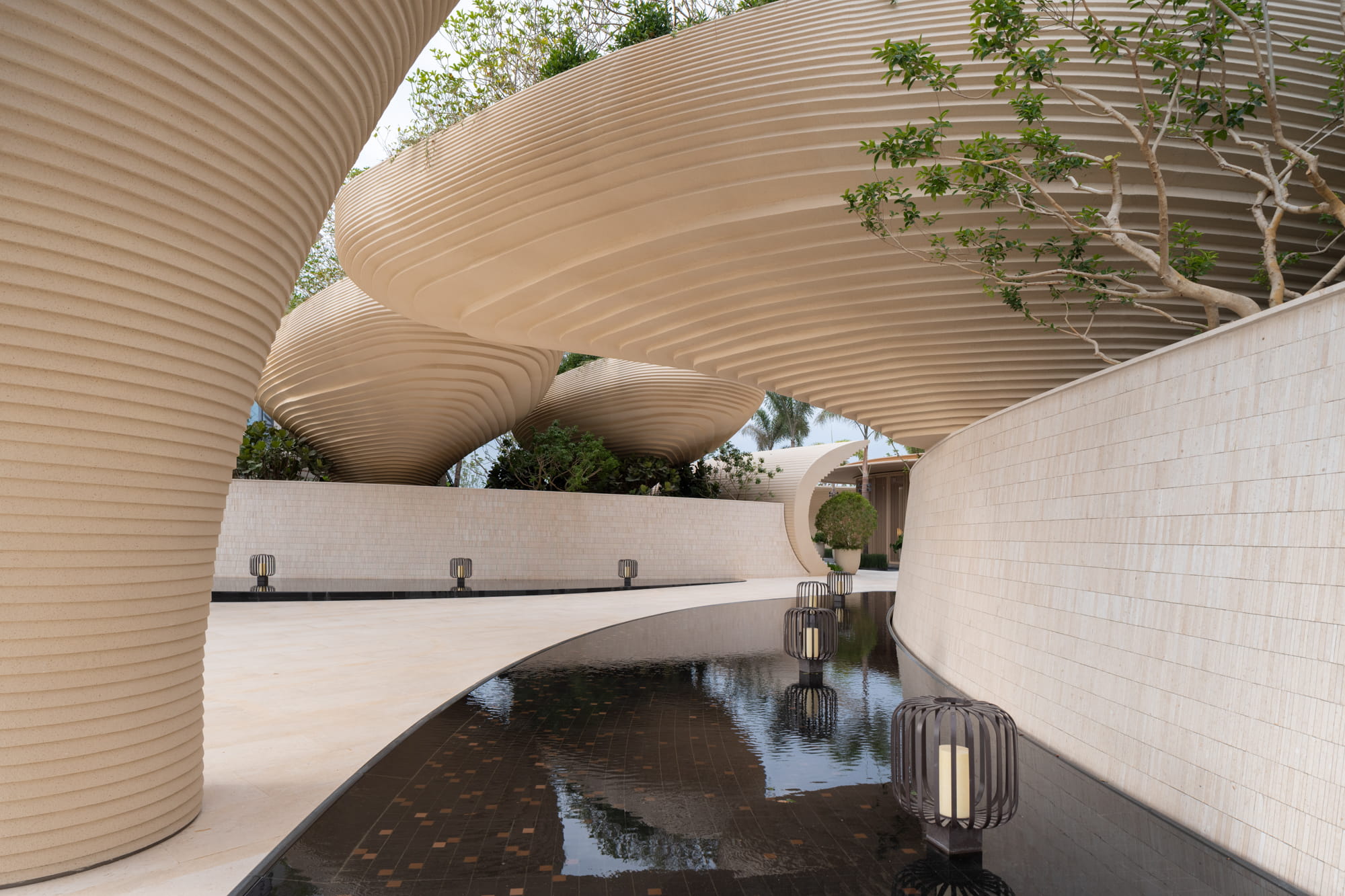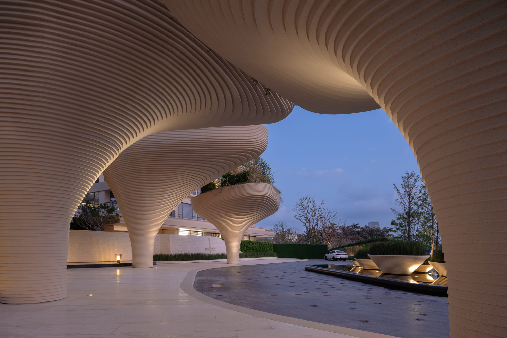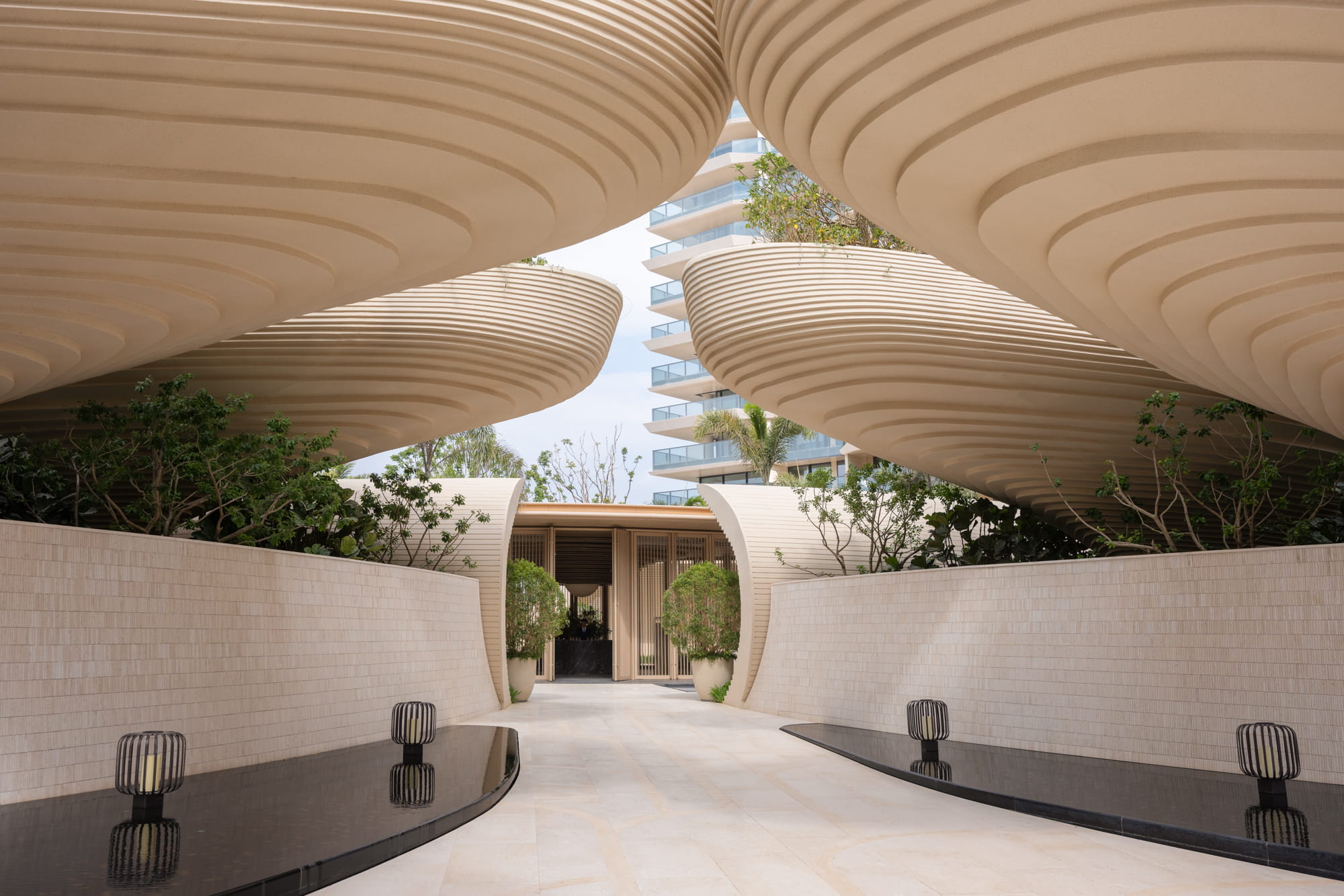 Large planting beds rhythmically arranged trees, and a central water feature guide the eye toward the iconic landscape element and drop-off zone. The sound of flowing water becomes an auditory transition, gently welcoming visitors and marking the shift from the external environment into the inner retreat.