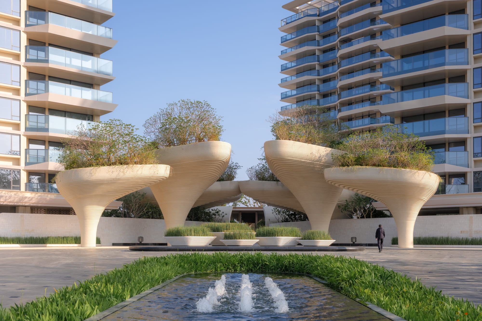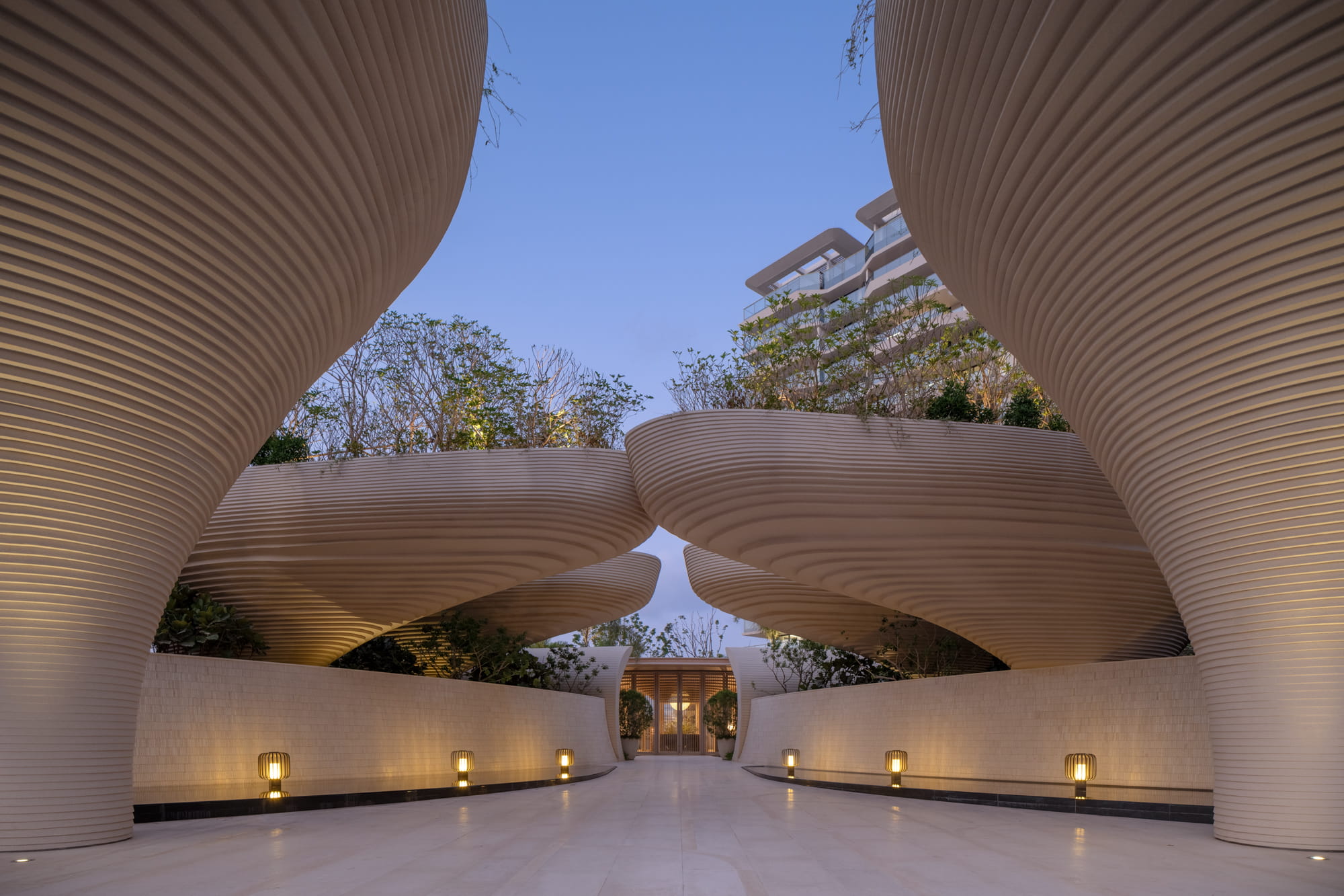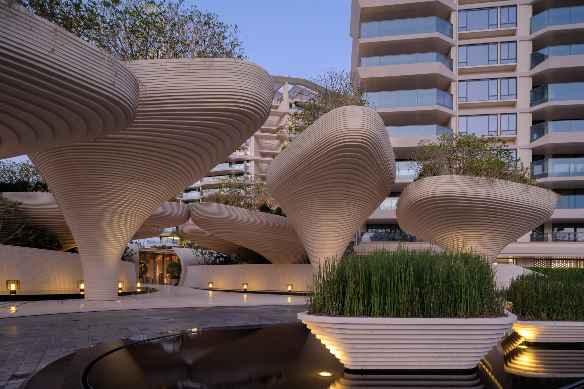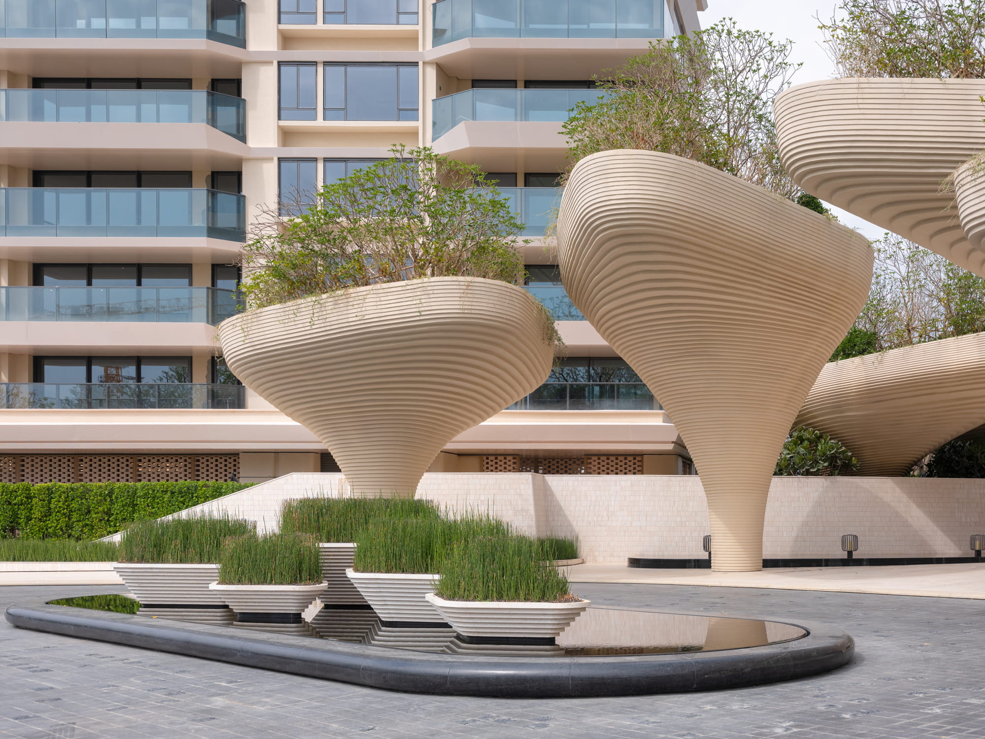 Large planting beds rhythmically arranged trees, and a central water feature guide the eye toward the iconic landscape element and drop-off zone. The sound of flowing water becomes an auditory transition, gently welcoming visitors and marking the shift from the external environment into the inner retreat.