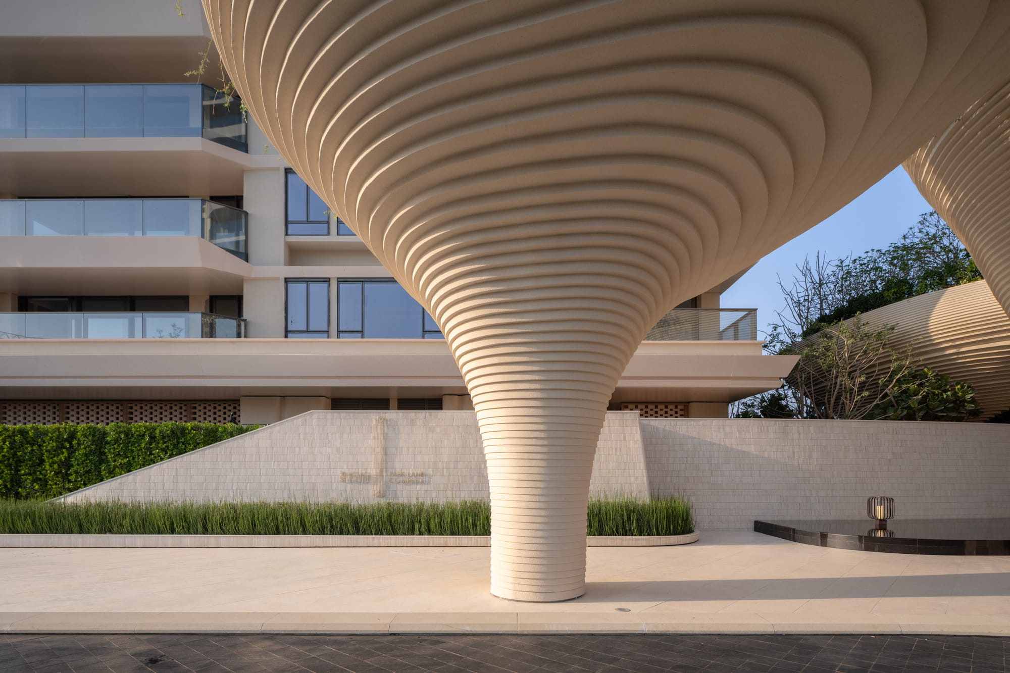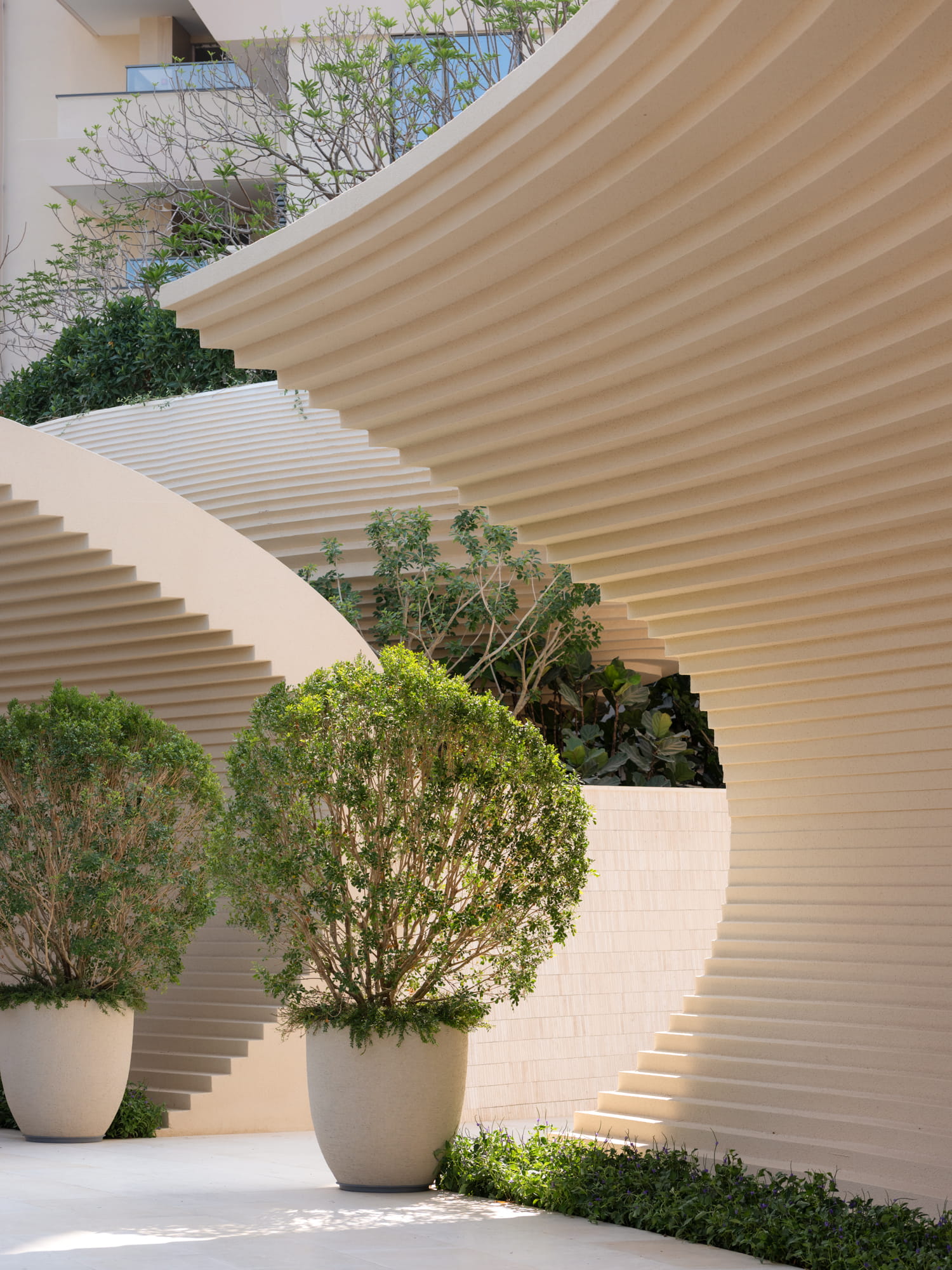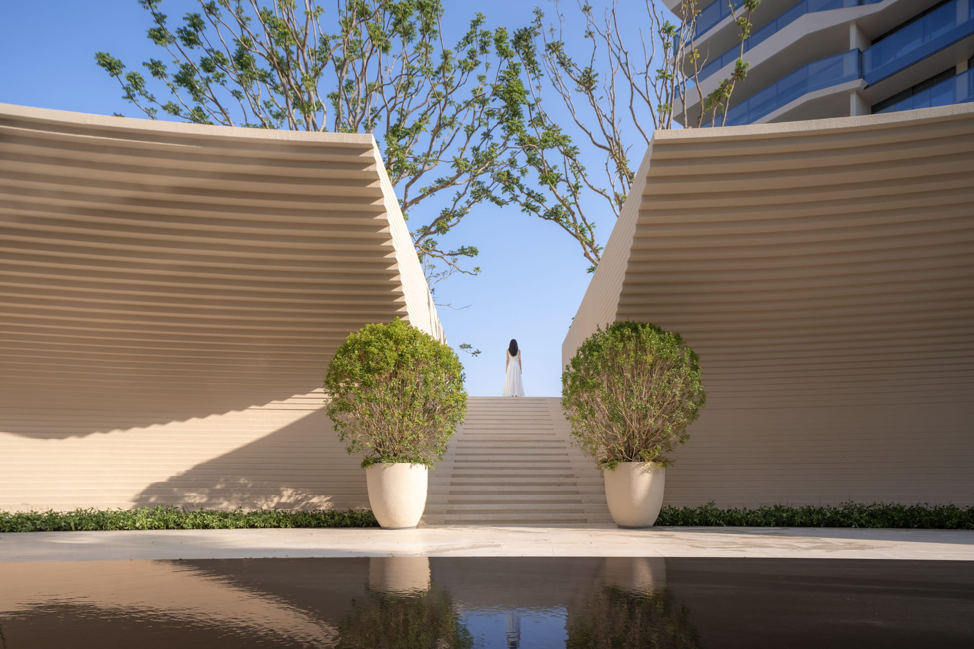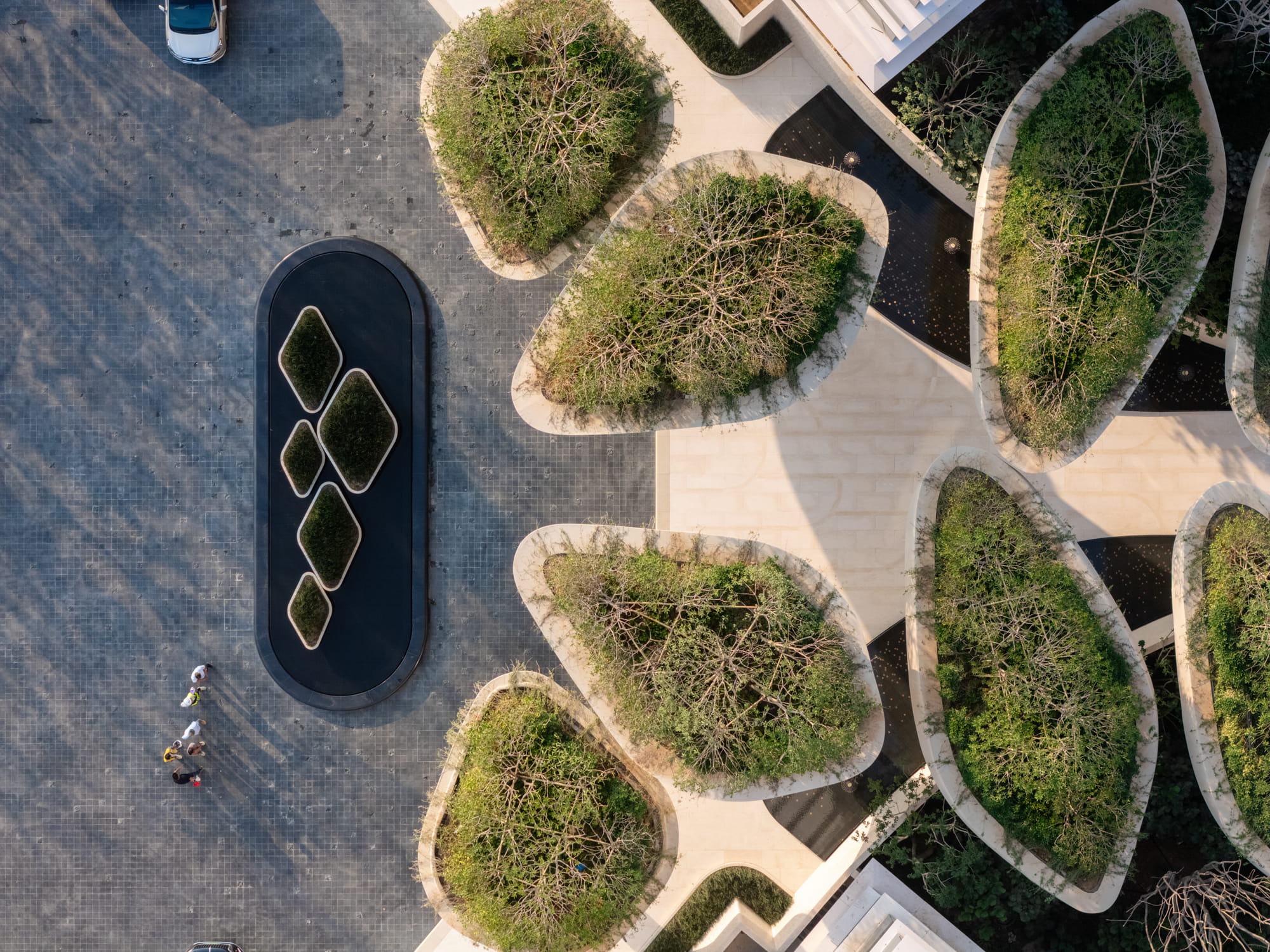 Large planting beds rhythmically arranged trees, and a central water feature guide the eye toward the iconic landscape element and drop-off zone. The sound of flowing water becomes an auditory transition, gently welcoming visitors and marking the shift from the external environment into the inner retreat.