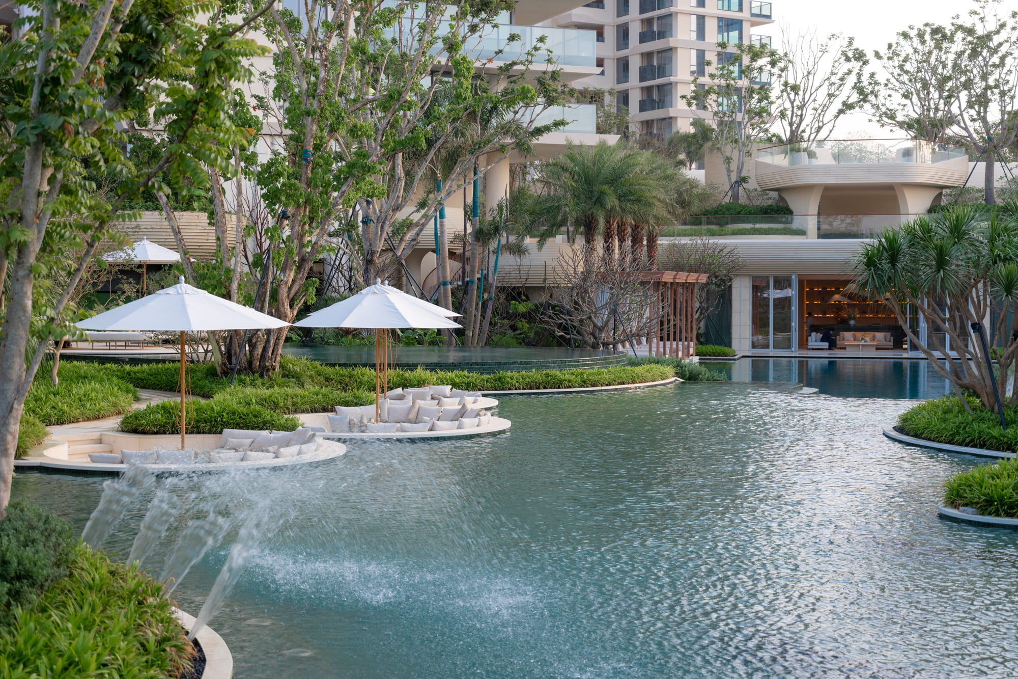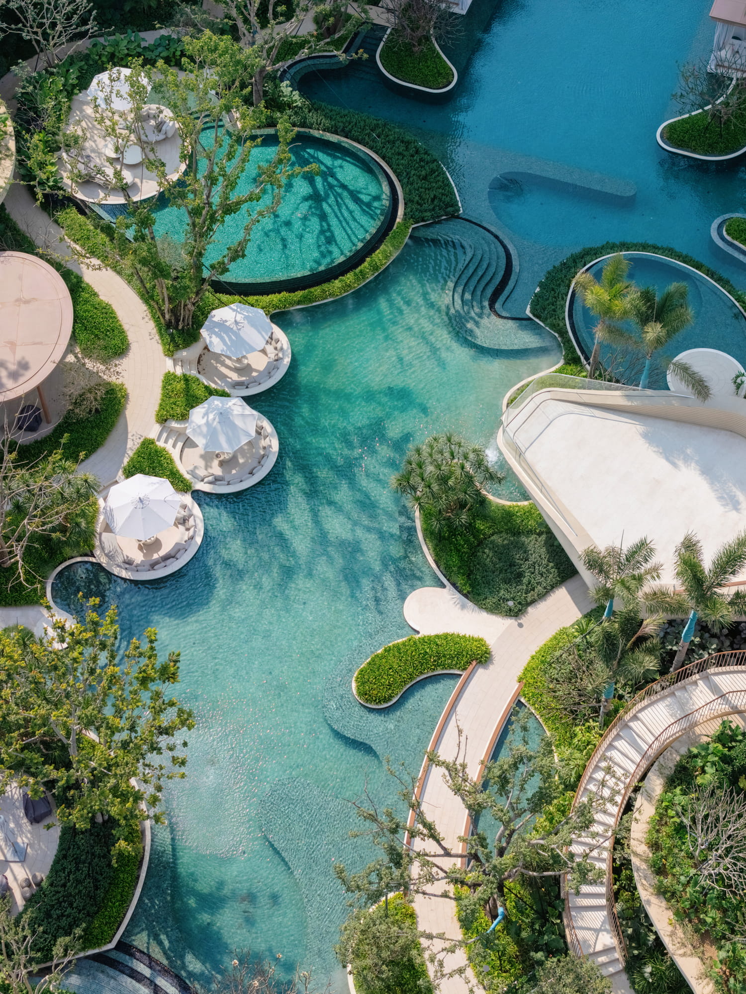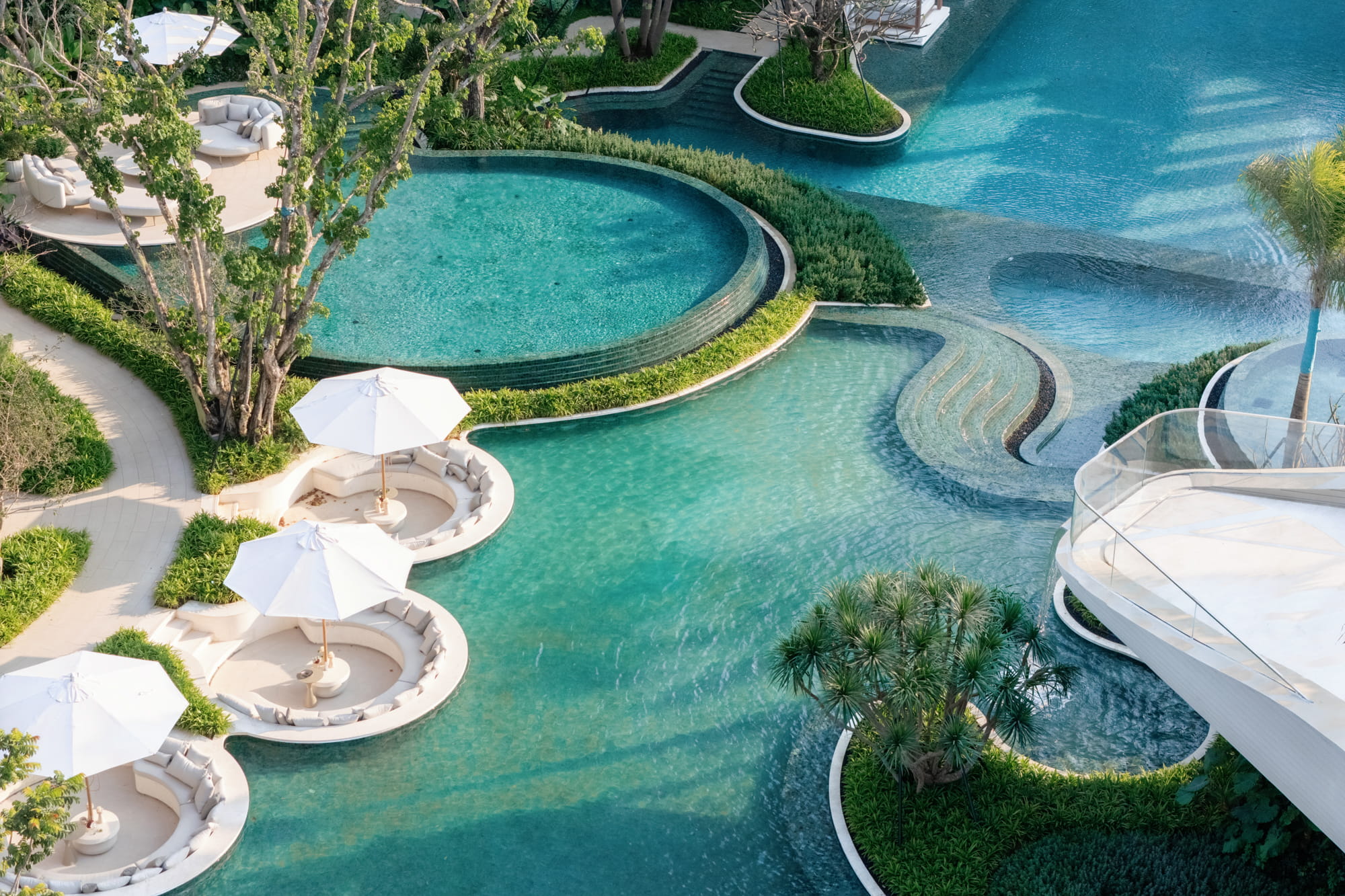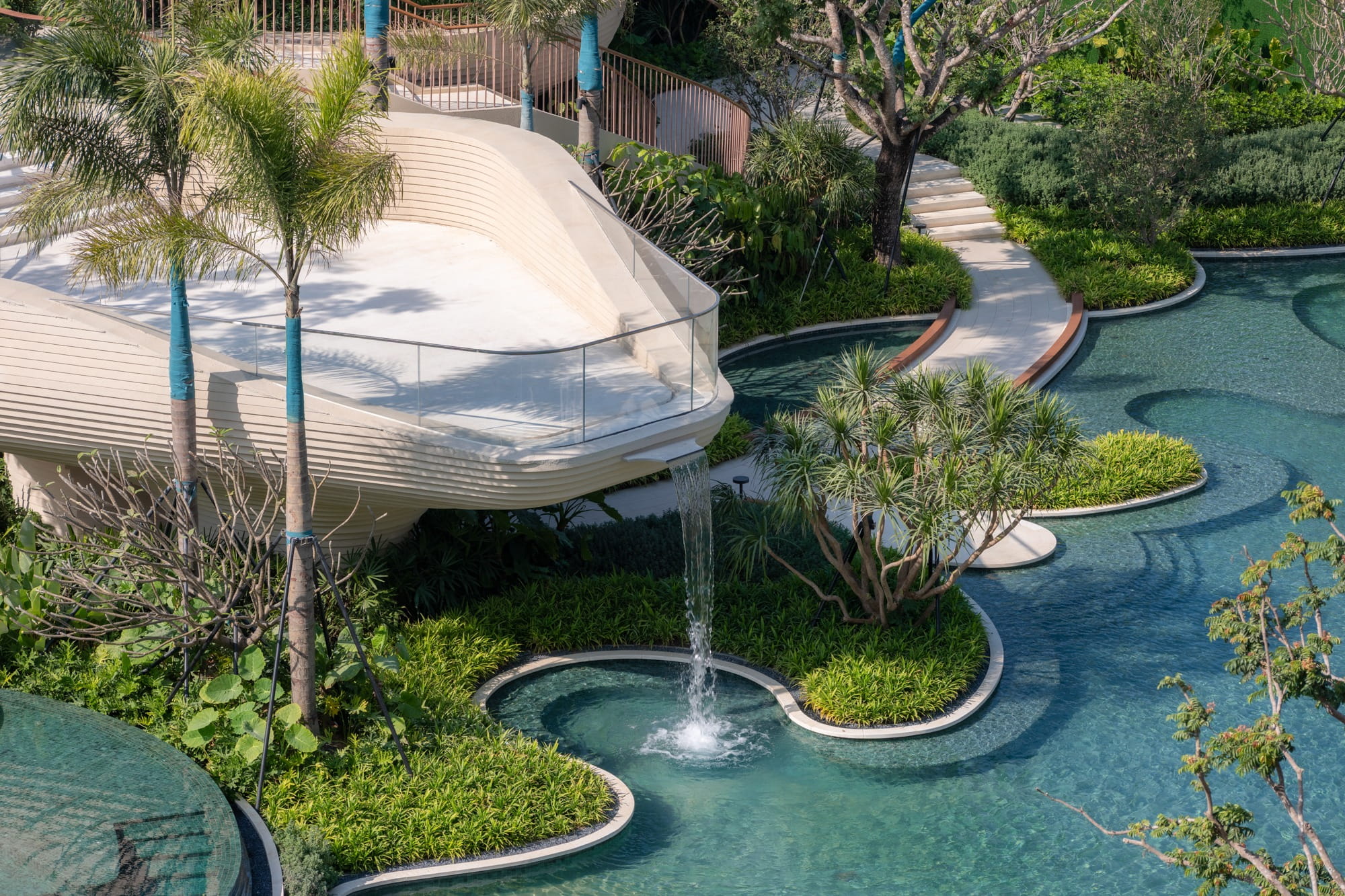 Trees are strategically planted around the pools to form a lush green backdrop, filtering views of surrounding buildings and framing the multi-layered water axis reinforcing the image of a tropical forest oasis.