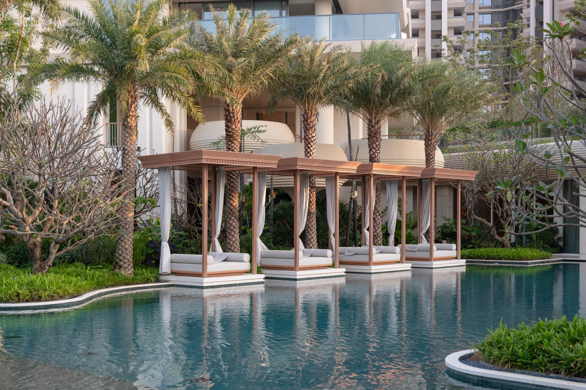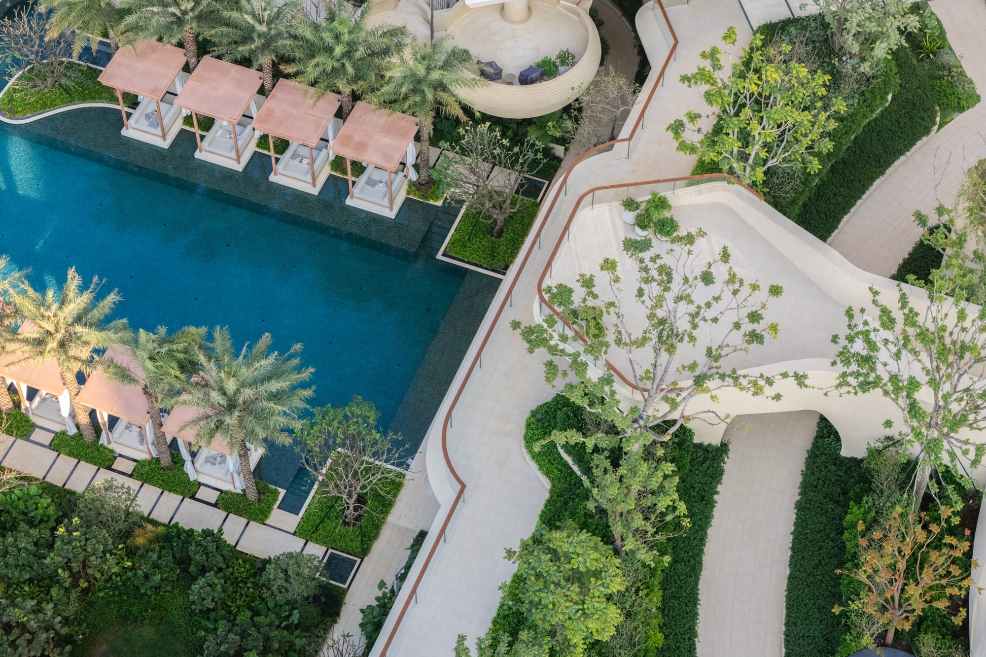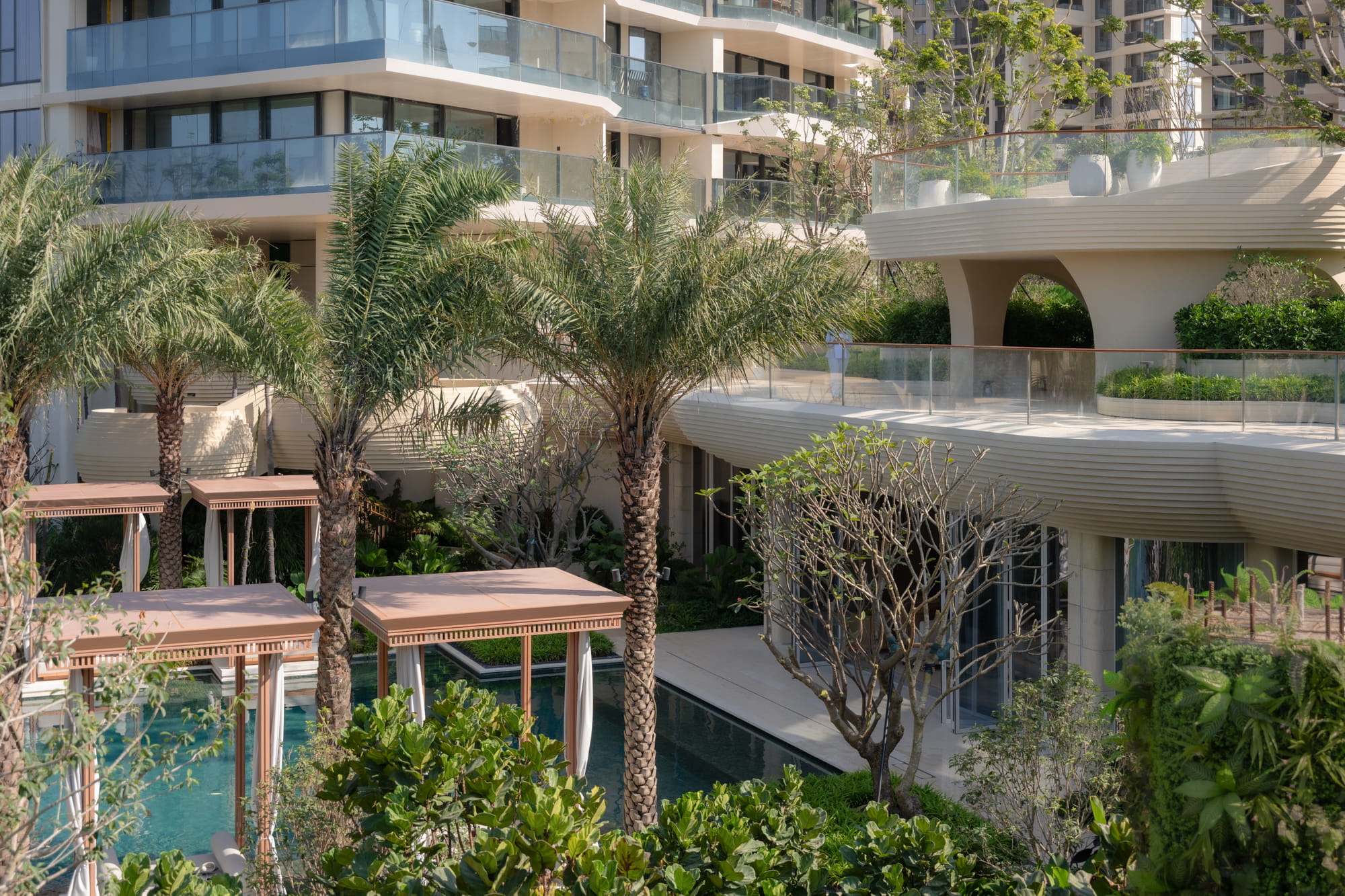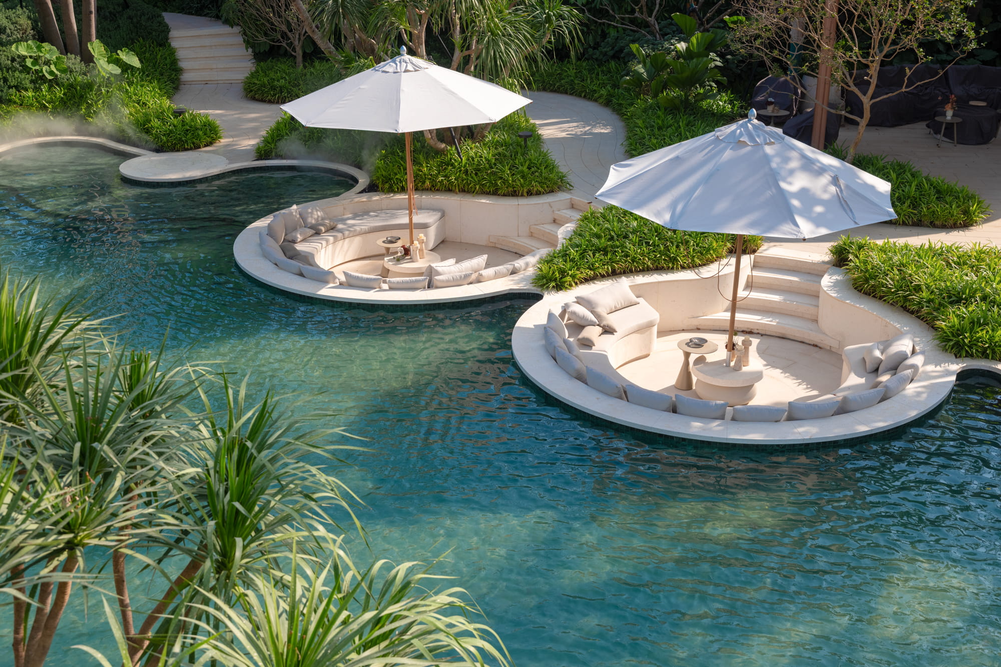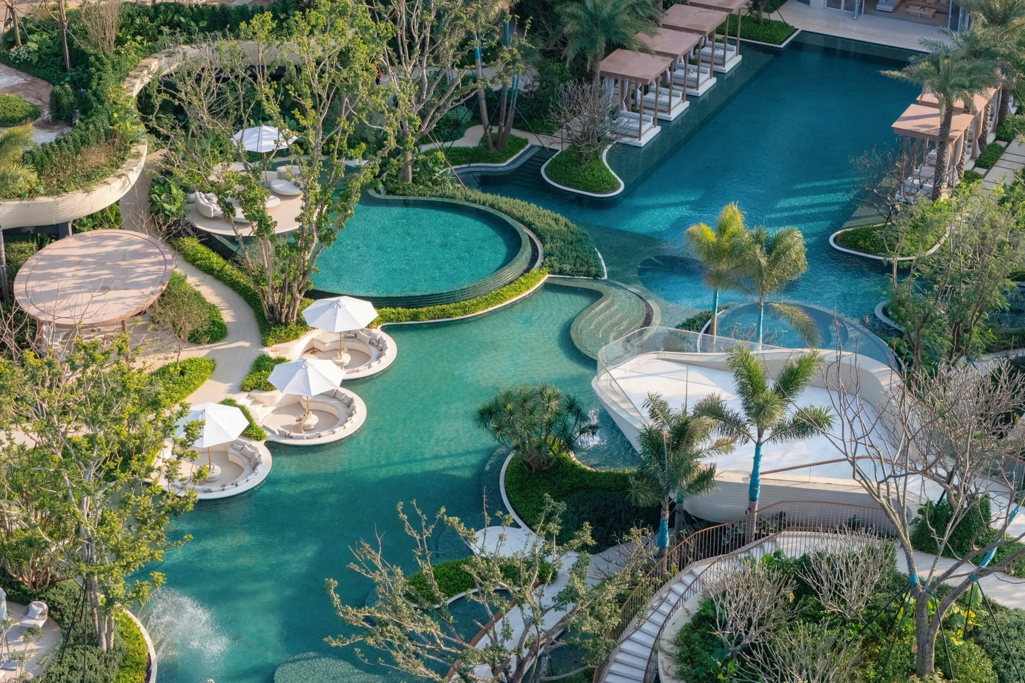 Trees are strategically planted around the pools to form a lush green backdrop, filtering views of surrounding buildings and framing the multi-layered water axis reinforcing the image of a tropical forest oasis.