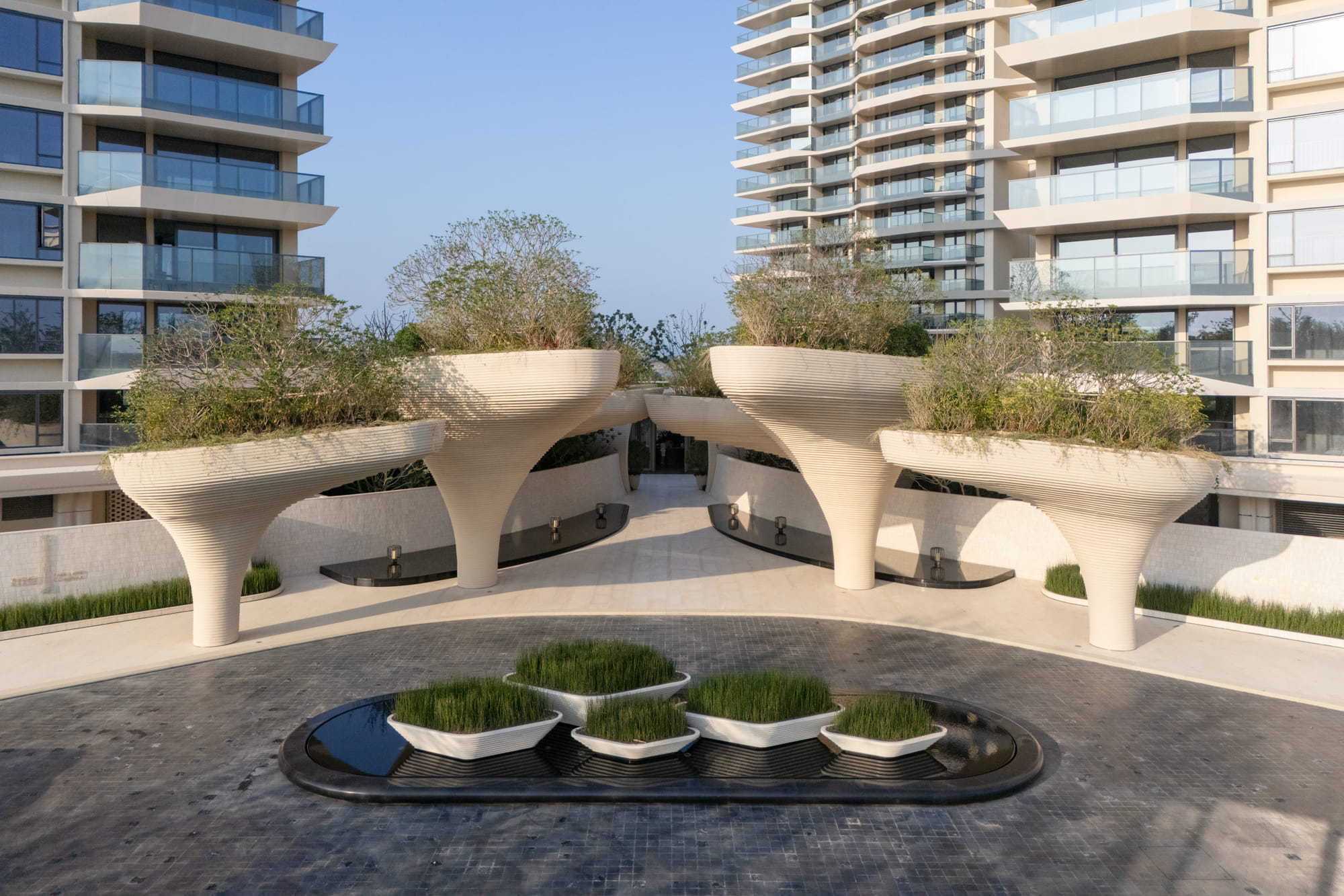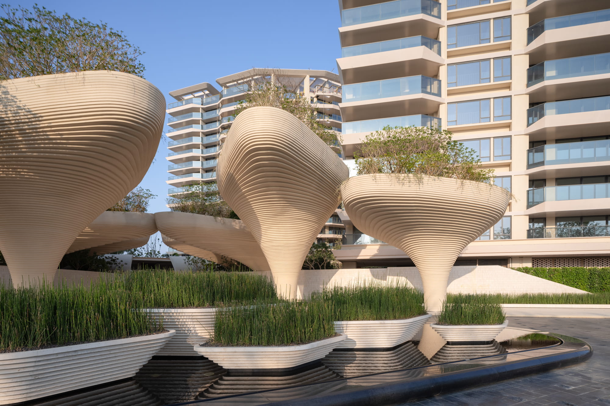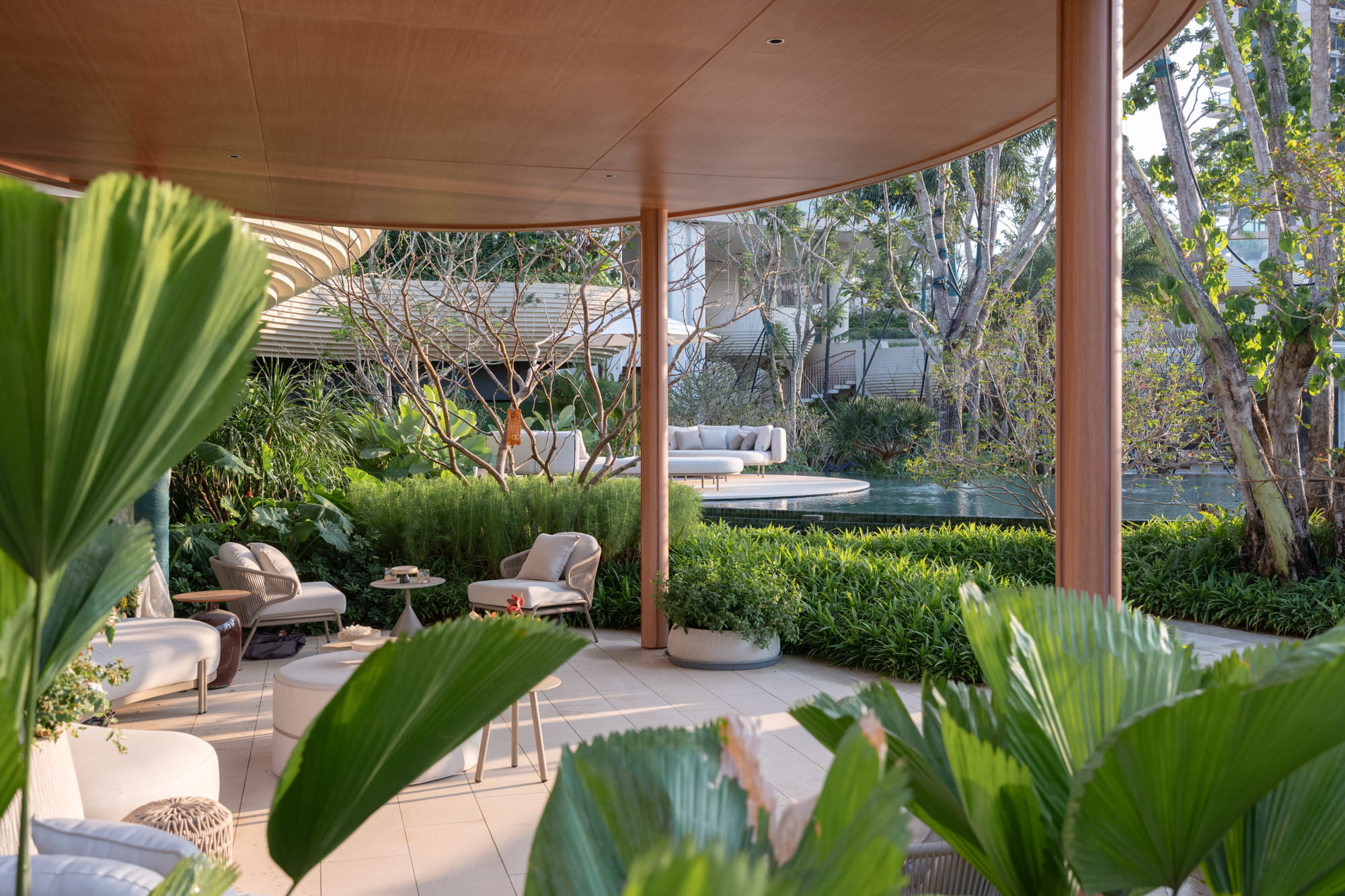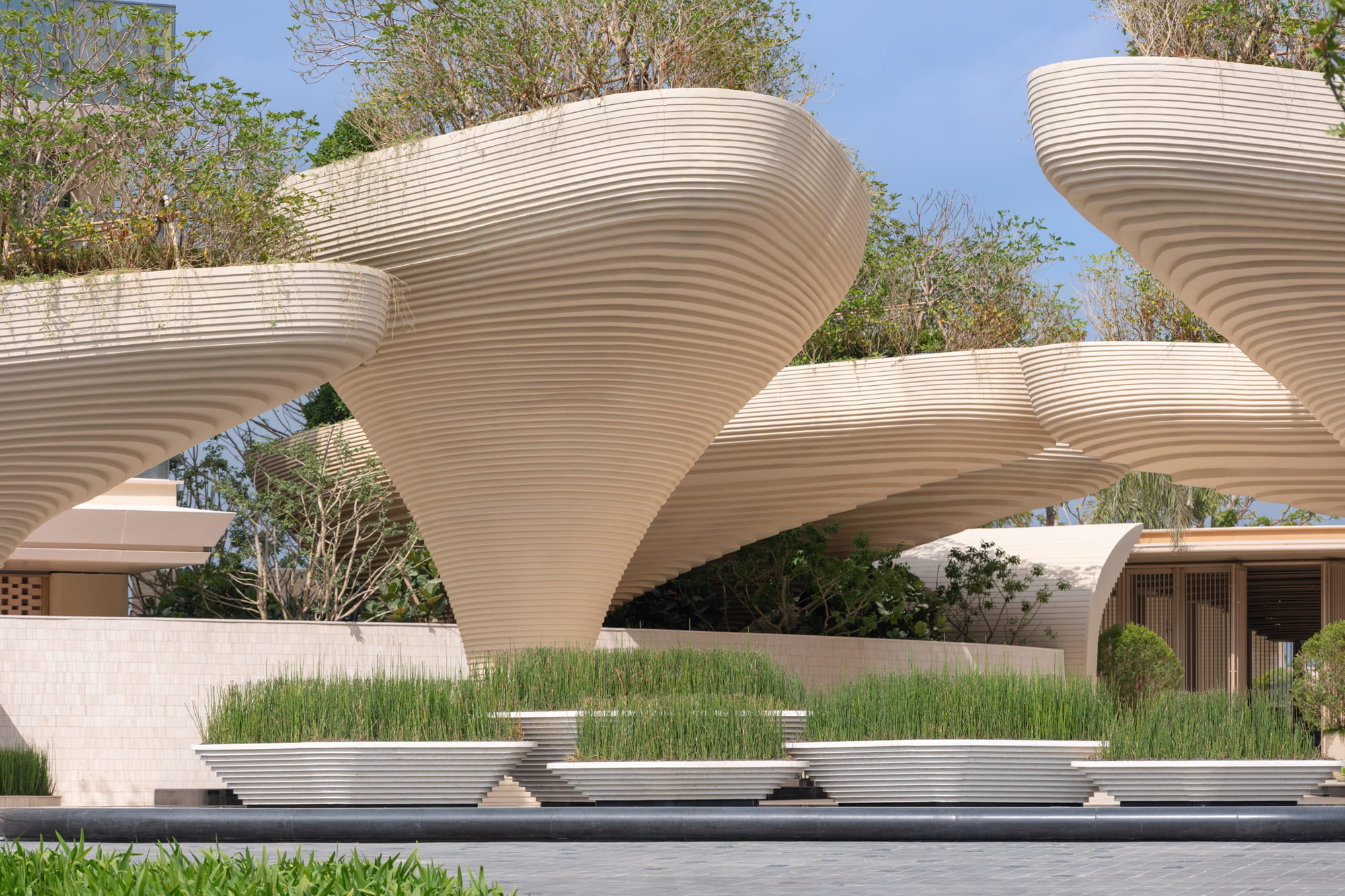 Trees are strategically planted around the pools to form a lush green backdrop, filtering views of surrounding buildings and framing the multi-layered water axis reinforcing the image of a tropical forest oasis.