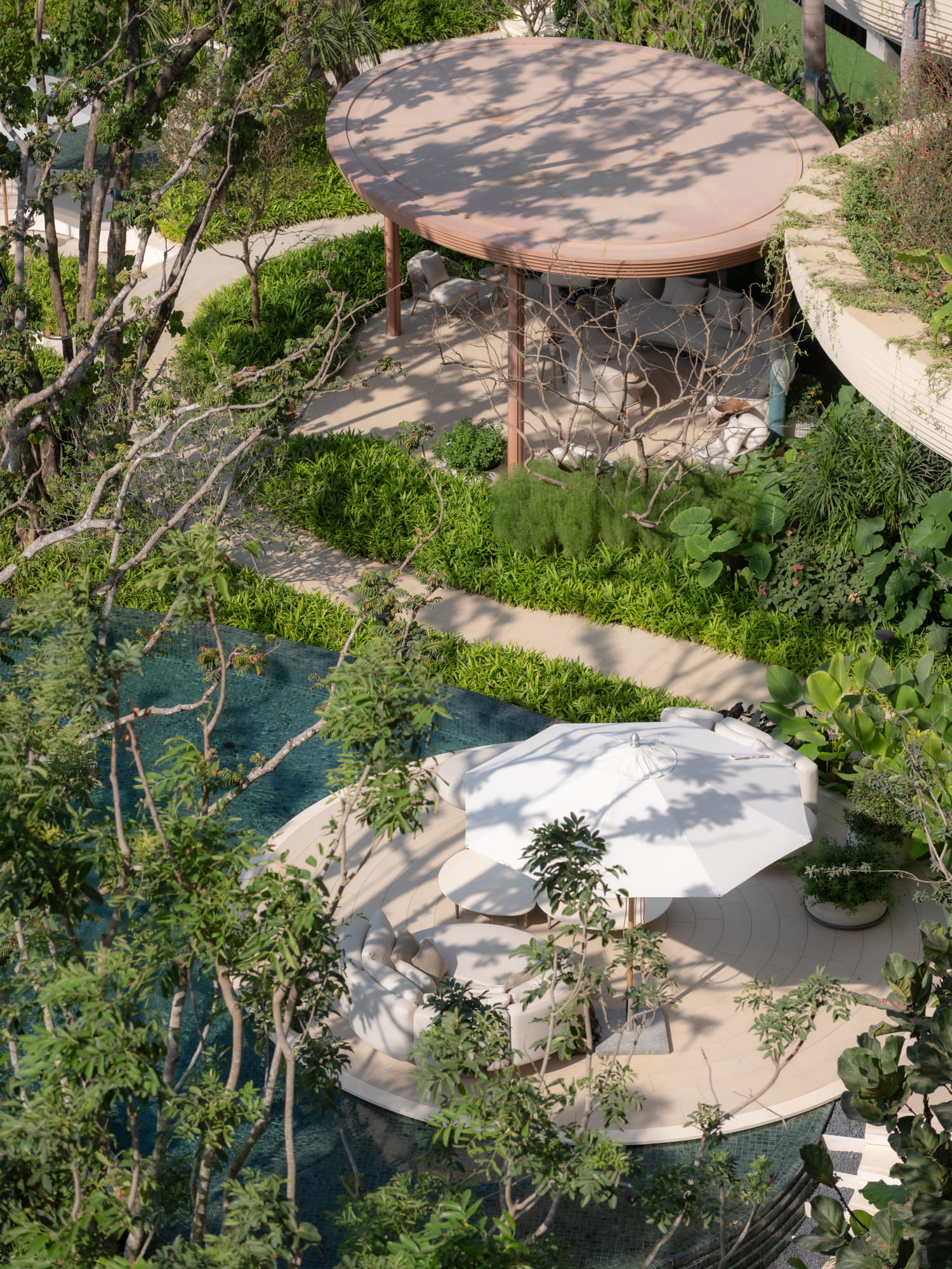 Circulation is thoughtfully planned to connect the pool seamlessly with residential levels and parking areas, ensuring smooth movement and gradually leading users into the central oasis.