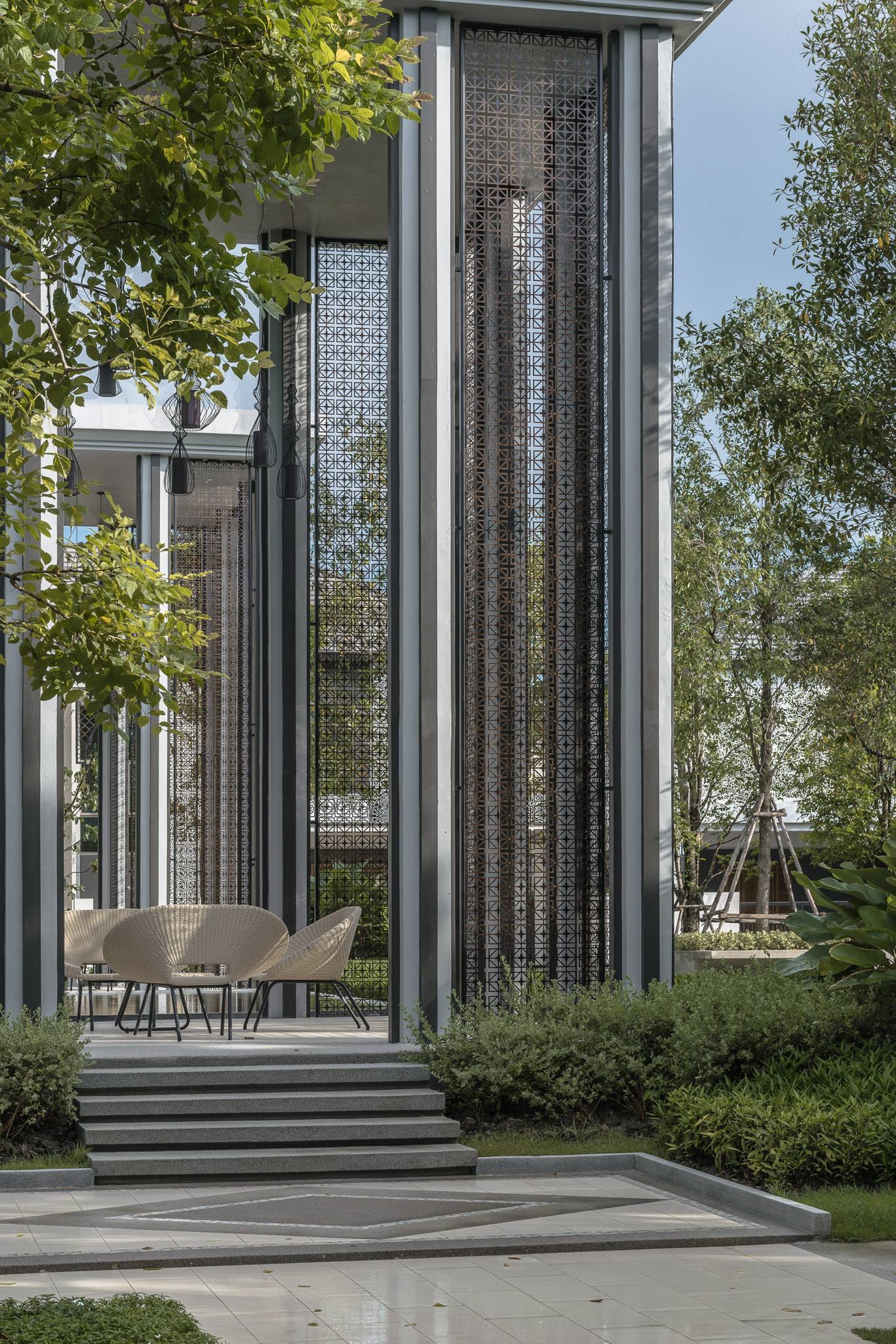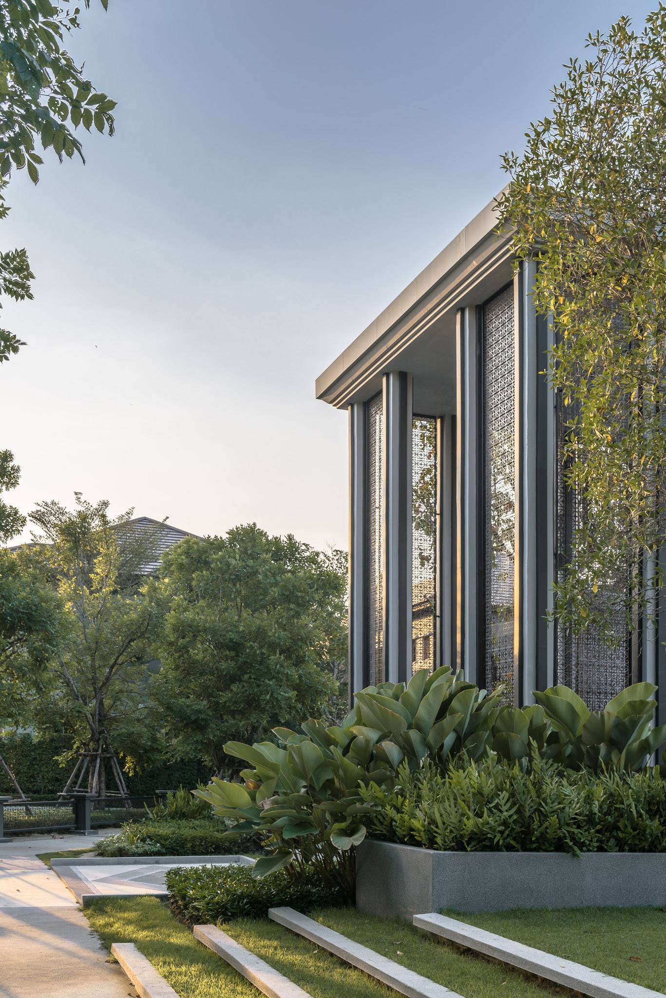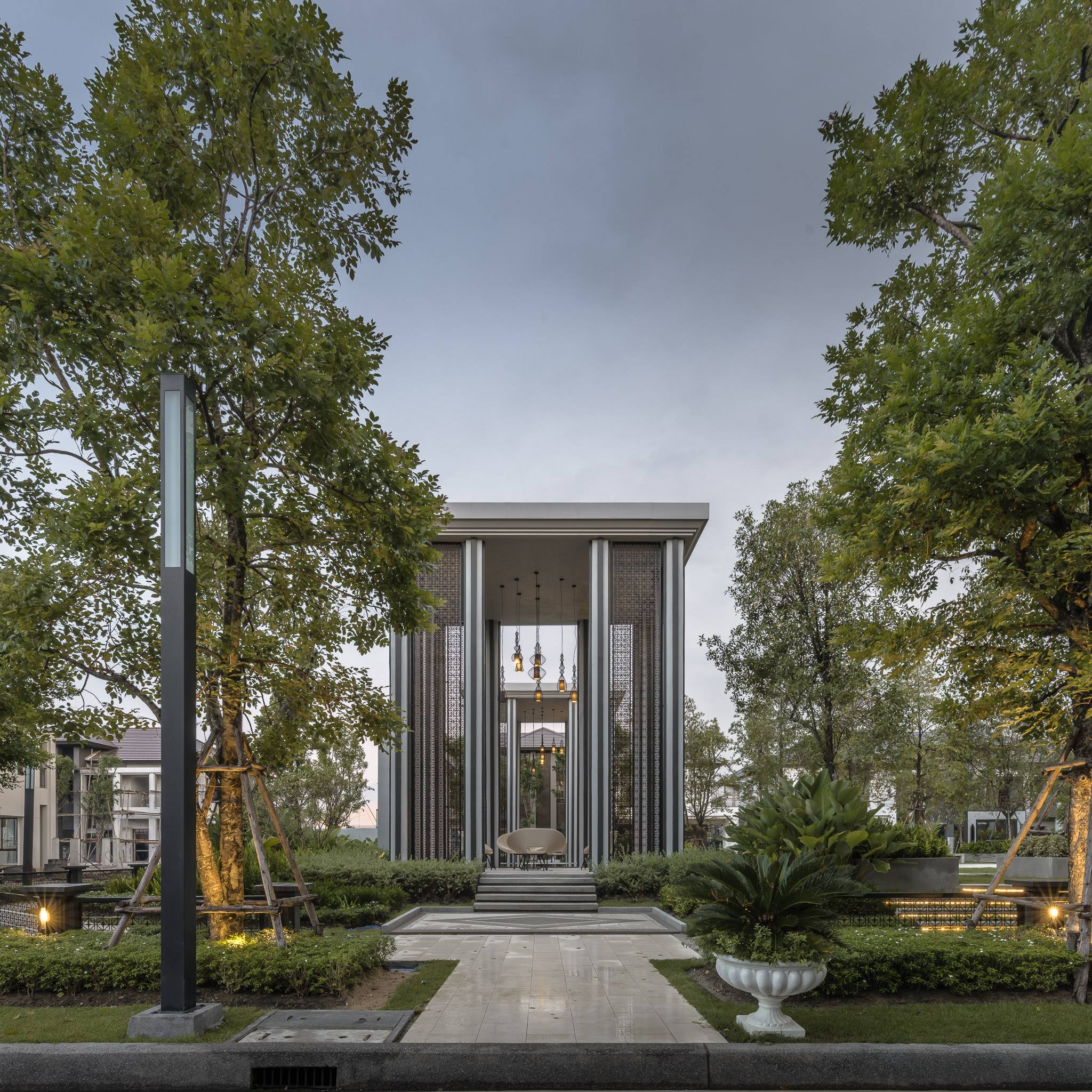 One of the prime single house development on Srinakarin Road, Grand Bangkok Boulevard by SC Asset illustrates the quality of living among the nature. Along the main entrance from Srinakarin Road to the main gate is the grand boulevard nestled by the lush greenery as a transitional space from the busy street outside to the private sanctuary. The clubhouse offers the semi-indoor pool overlooking to the garden. The architectural gridline subtly frames the visual axis offering the continuity of visual perception from interior to exterior as if it is one large clubhouse.