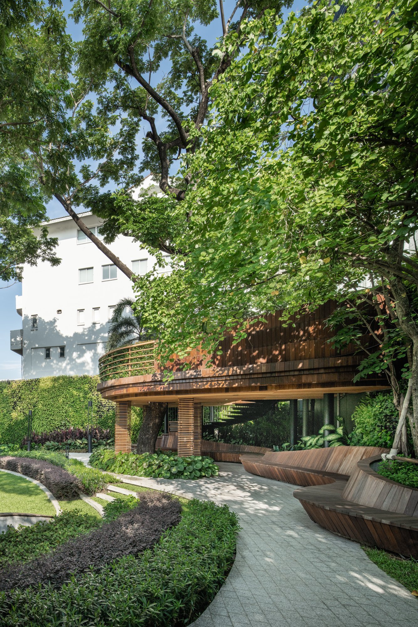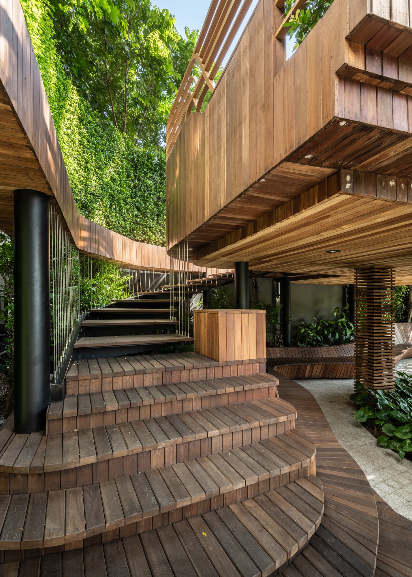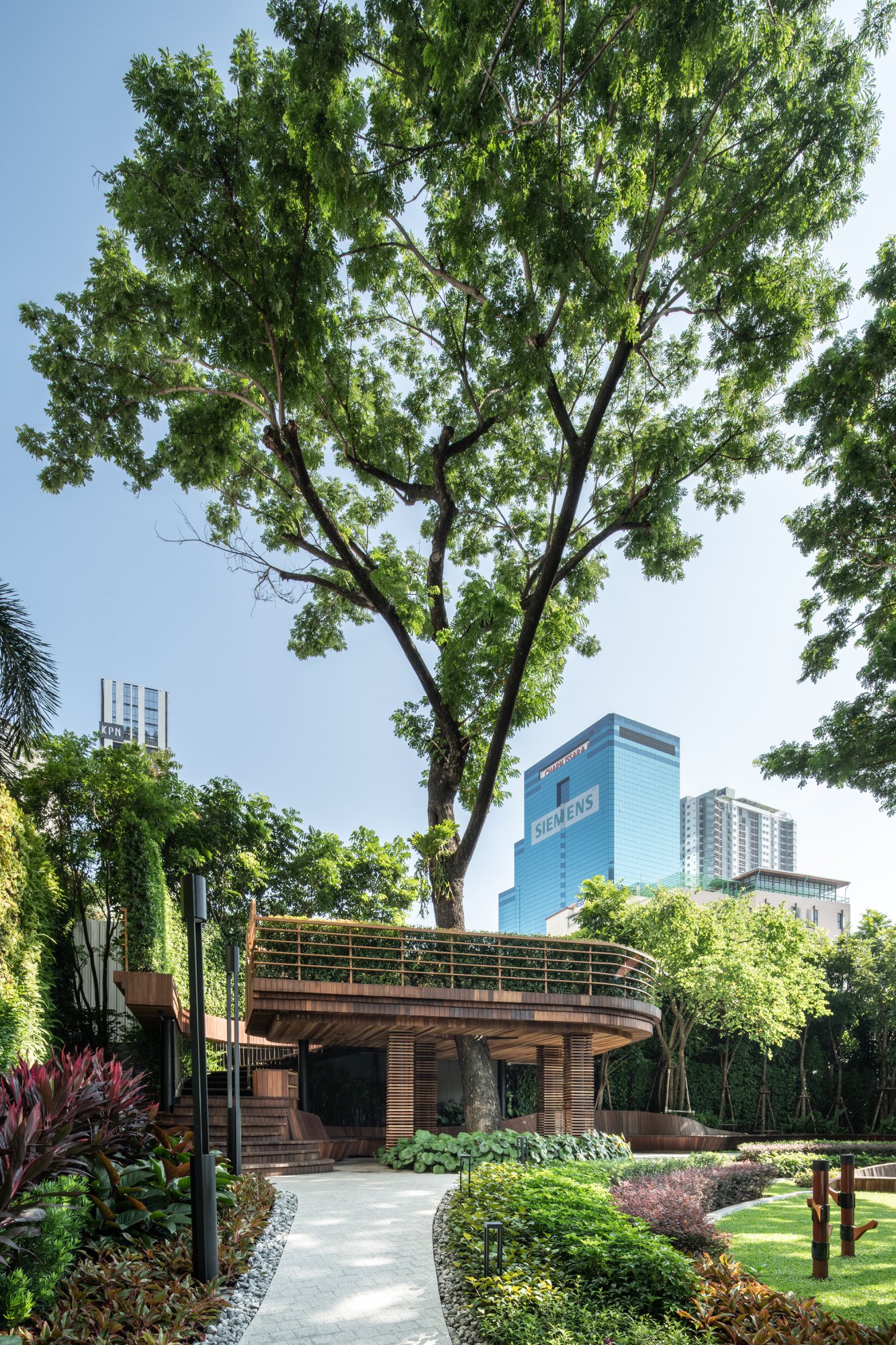 设计灵感来自树木的年轮,曲线是设计的标志性元素,创造了特色设计语汇。景观设计概念通过现状雨树的位置形成简约的花园路径,环绕场地形成平缓竖向变化。花园的特色是摩登树屋,在地面提供遮荫舒适的角落,在空中提供露天开放的平台。