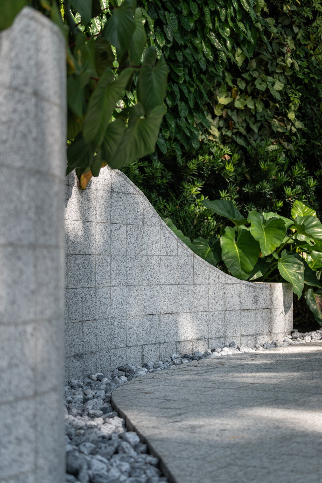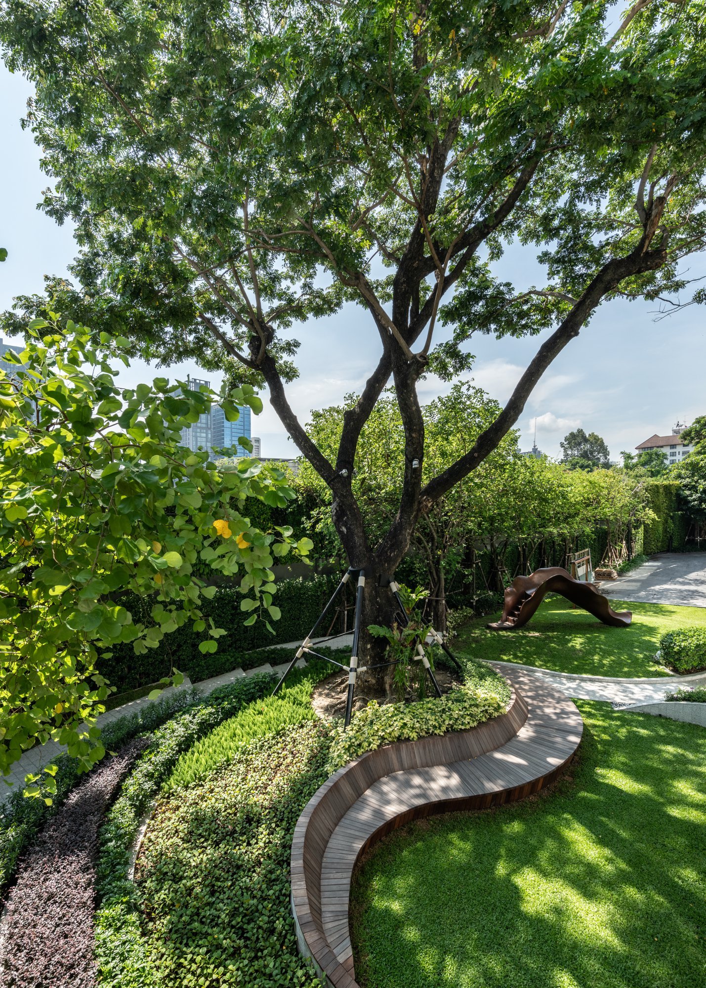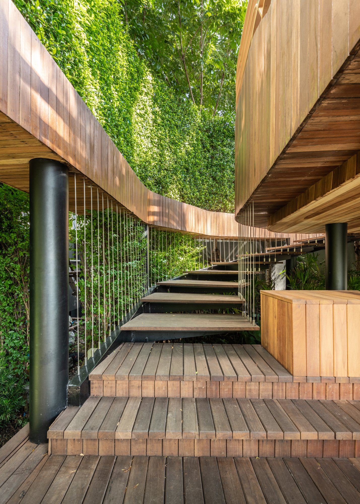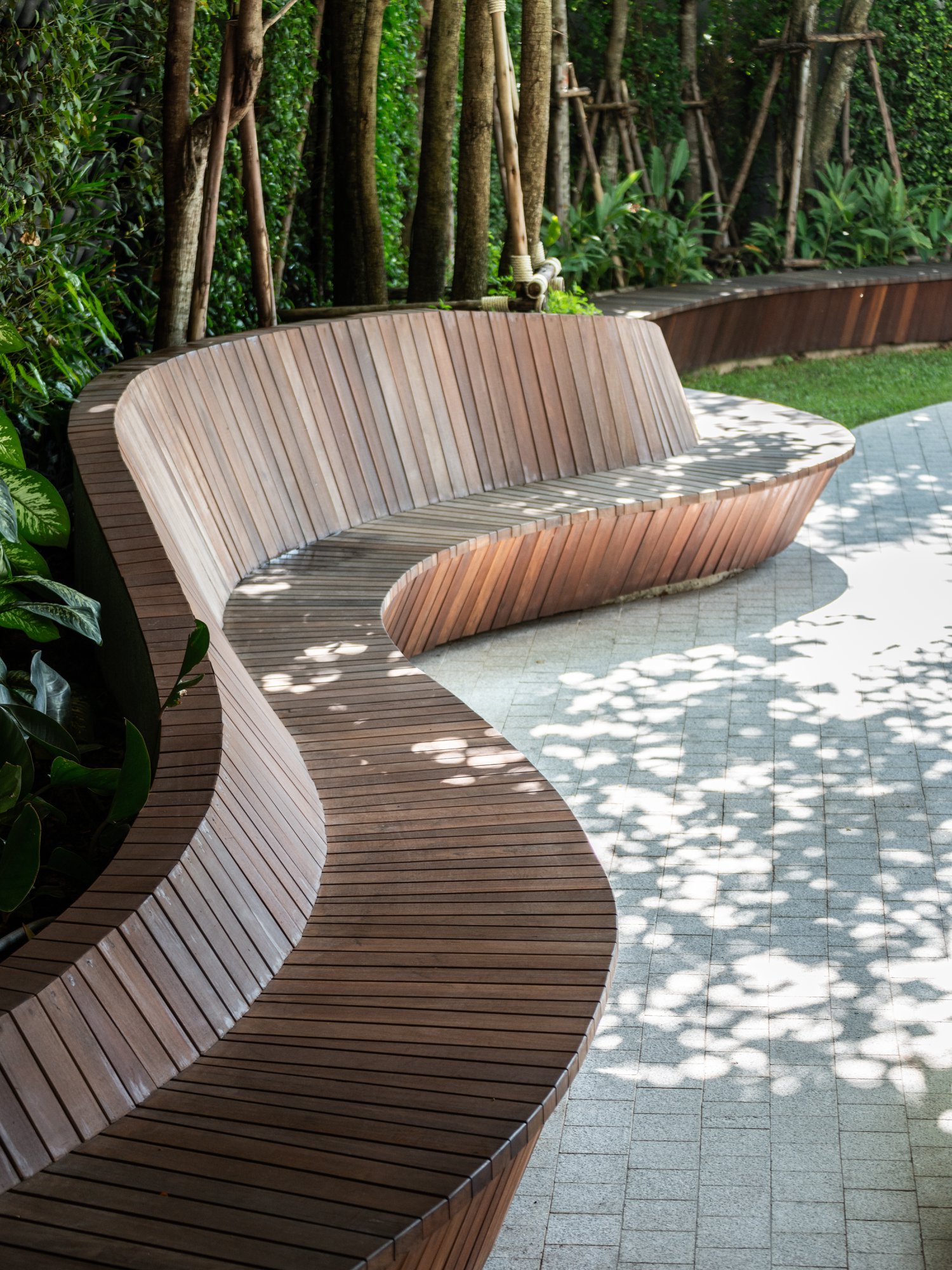 设计灵感来自树木的年轮,曲线是设计的标志性元素,创造了特色设计语汇。景观设计概念通过现状雨树的位置形成简约的花园路径,环绕场地形成平缓竖向变化。花园的特色是摩登树屋,在地面提供遮荫舒适的角落,在空中提供露天开放的平台。