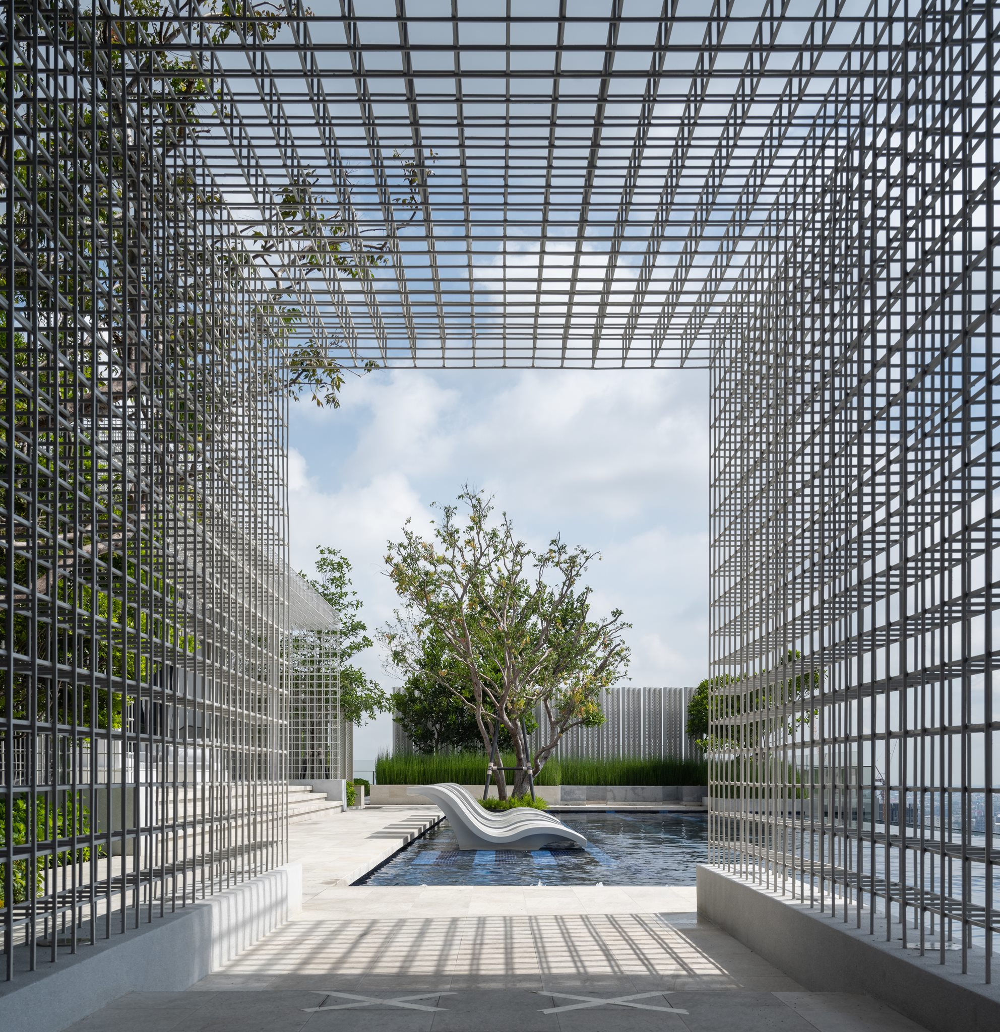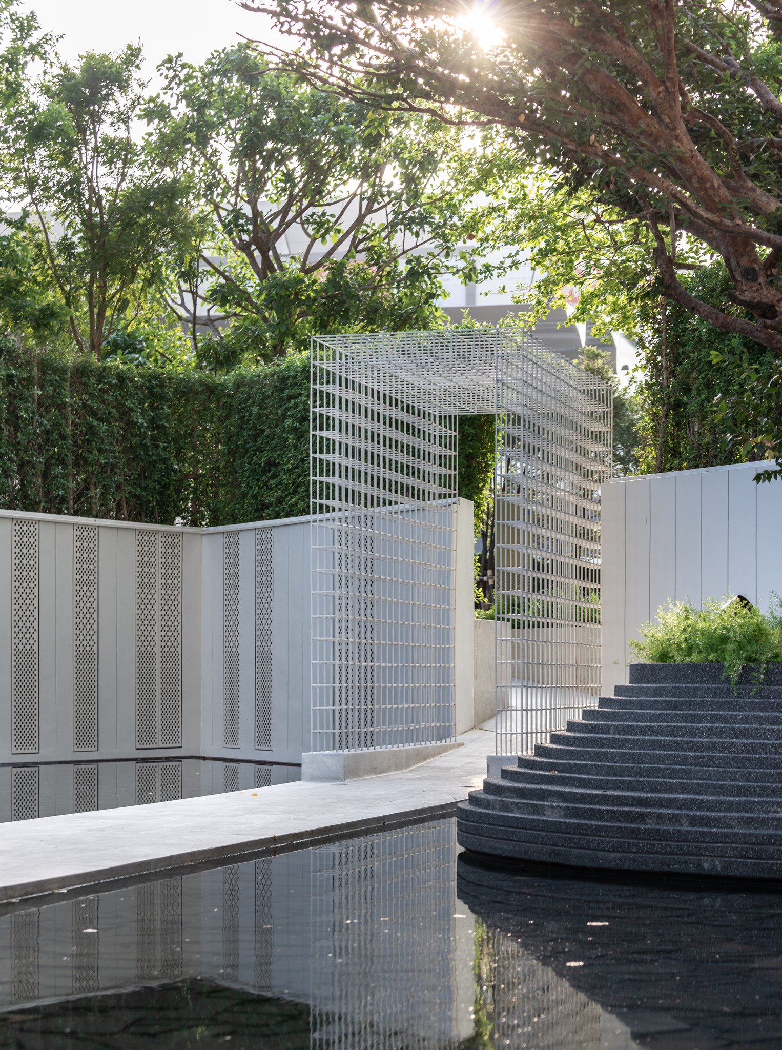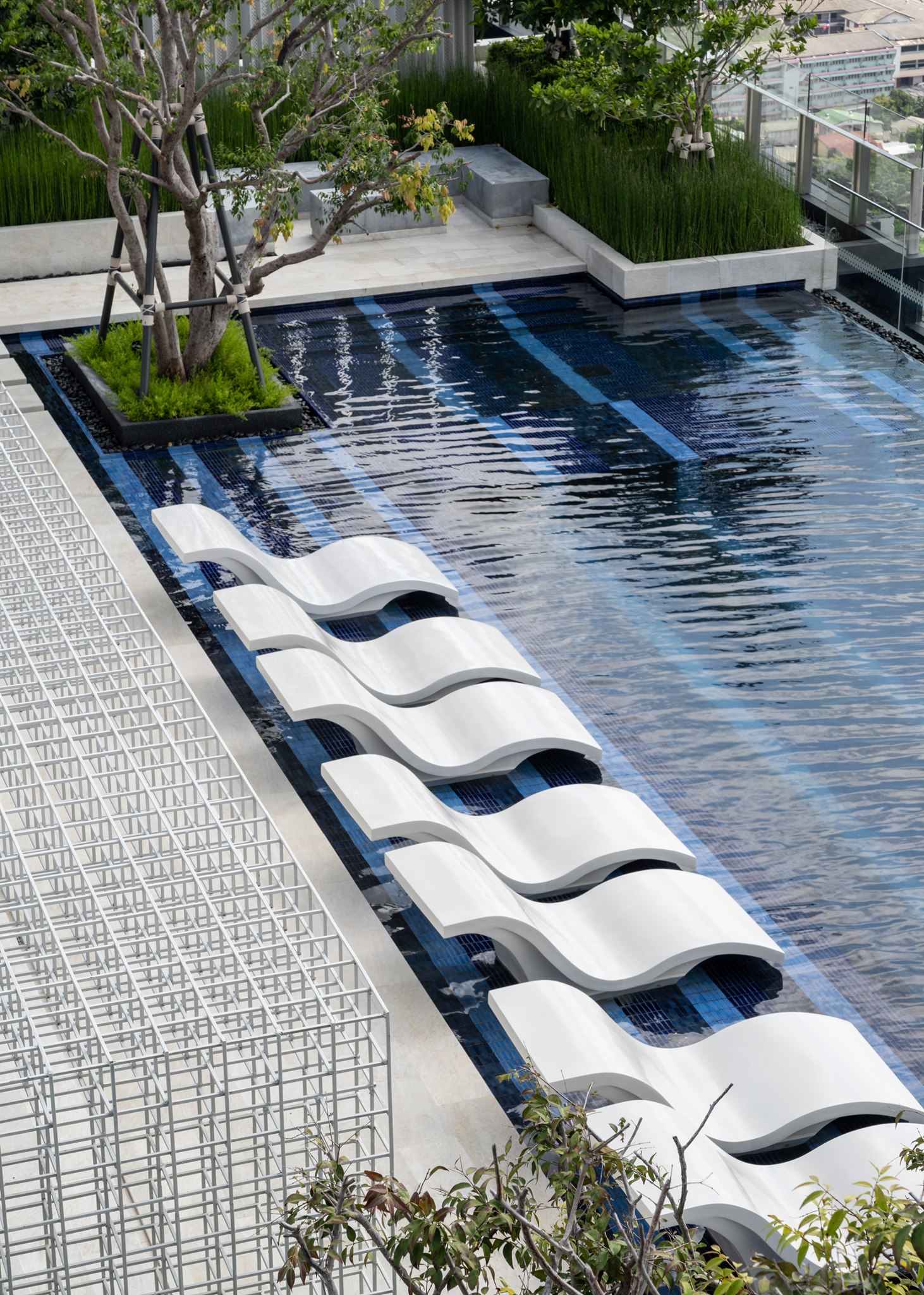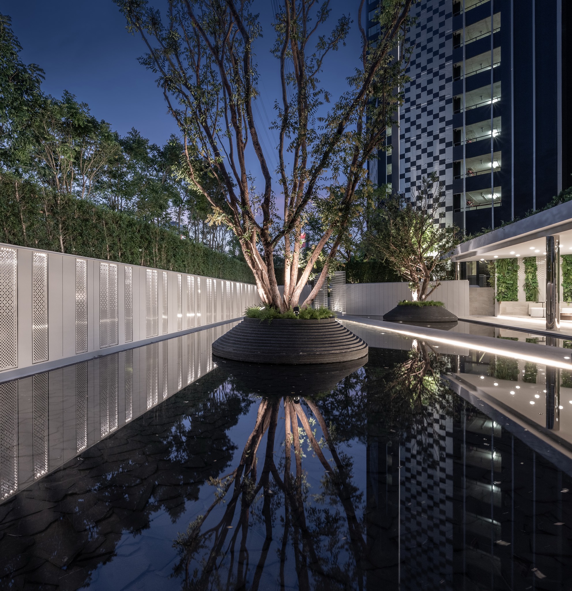 An aqua oasis garden, strategically defined as a sunken courtyard and intricately crafted by the signature graphic on the vertical elements, subtly creates the passive courtyard with prime tranquility in contrast with the hustle and bustle of Ladprao district. This courtyard, serving as the contemplative functional space for the residents, features a large water surface with the floating passage called "the catwalk" in the center creating the accessible shortcut to both towers. Two feature trees are well composed at side in rounded planters. A feature pavilion, placed at the corner, has a full exposure to the controlled pleasant ambiance surrounded by the lush evergreen topiary and the over story provided by dense clusters of tree.