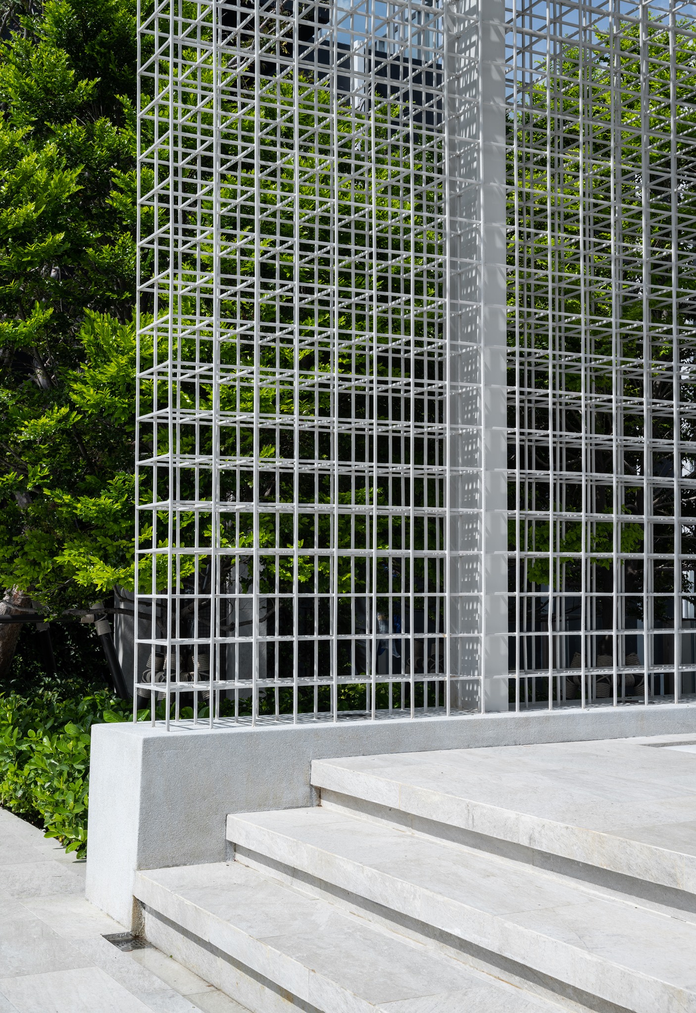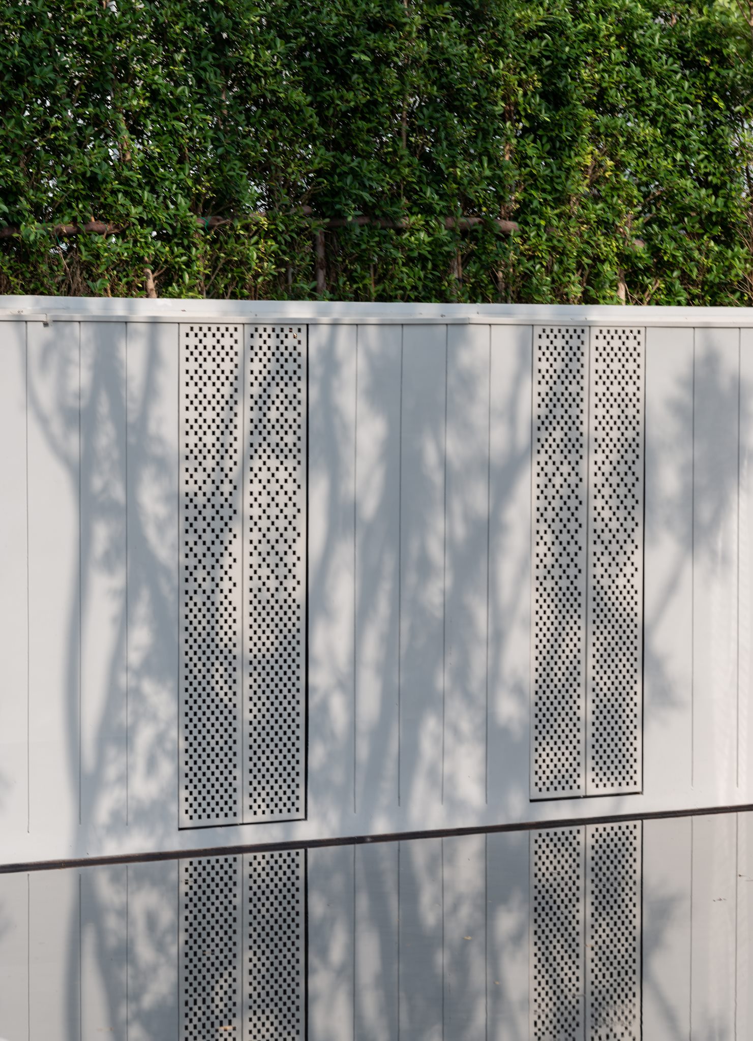 The entrance, created by feature walls and trees as backdrop, separately defines the pedestrian walkway from the vehicular entrance. Walking through the narrow path is the starting point of the serial experiences.